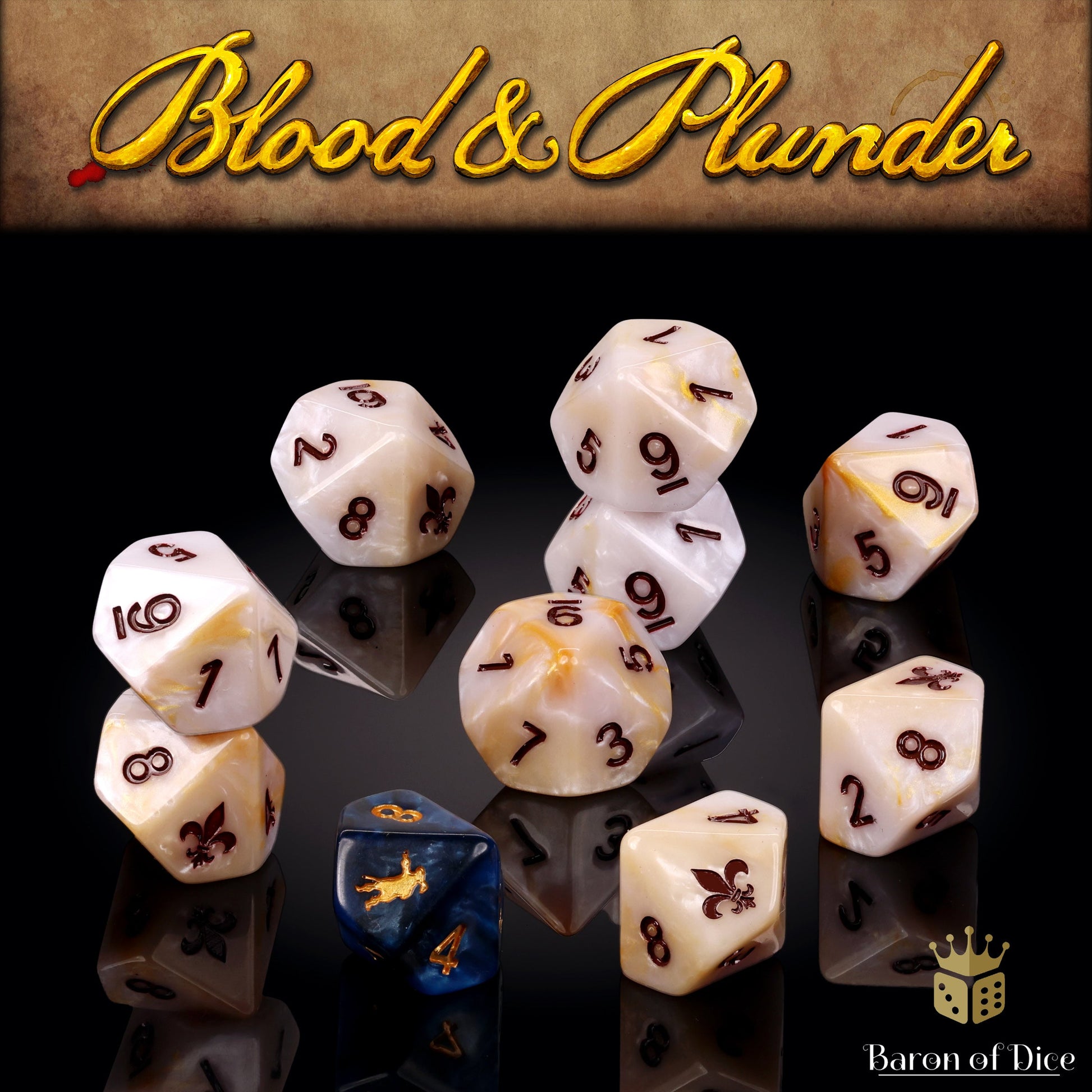 Our officially licensed Blood & Plunder dice set is ready to unleash a full barrage! Each set contains x9 country themed D10 dice along with a single unique oceanic colored commander D10; creating a full ten D10 dice inside a reusable metal tin.