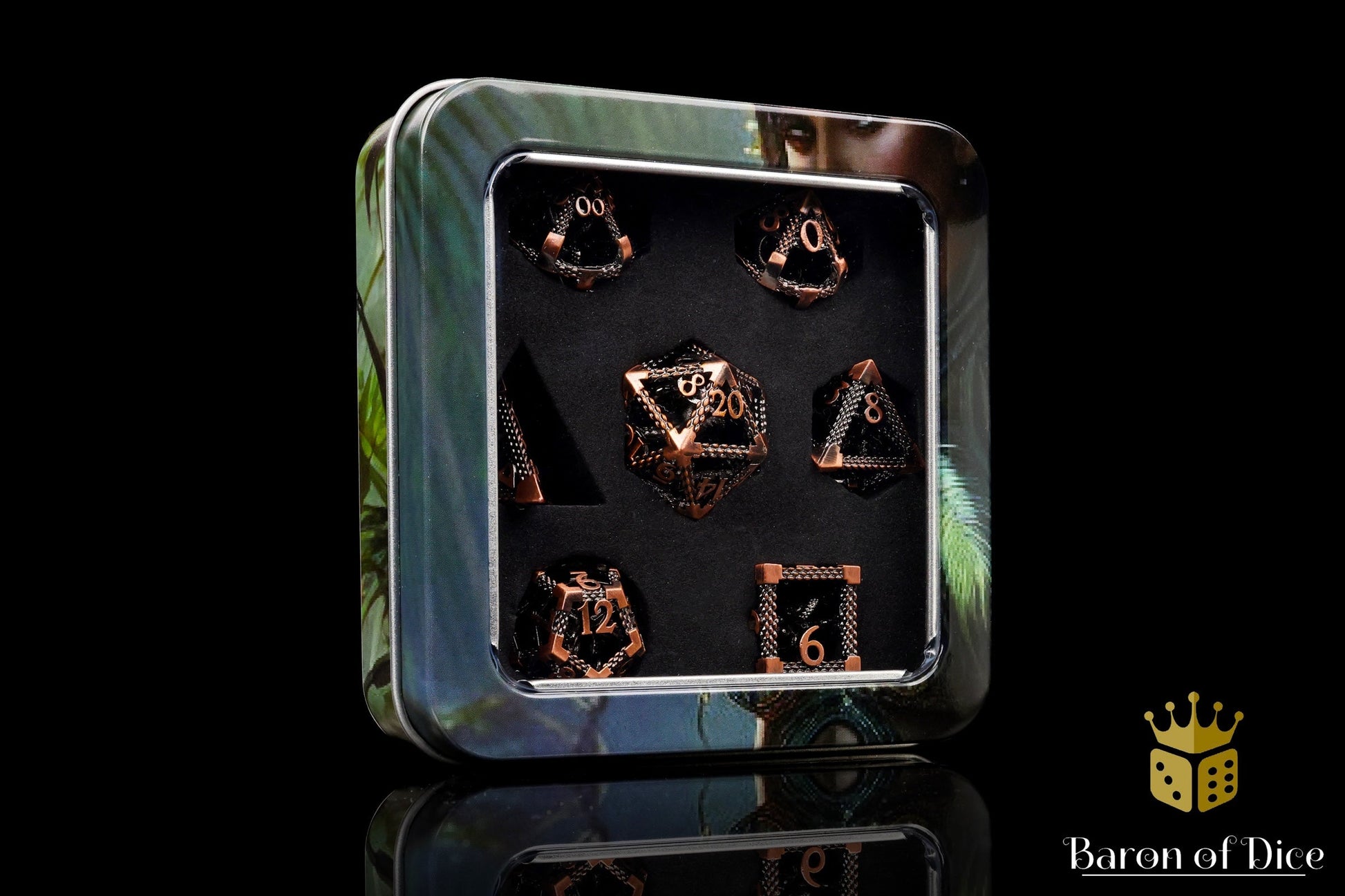 This set is furbished bronze from the depths of the sea. Featuring krakens, octopus, and squid designs across each die, in polished golden hues, these are ready to burst from the depths; premium metal 20mm dice set containing D4, D6, D8, D10, D10, D12, and D20.
