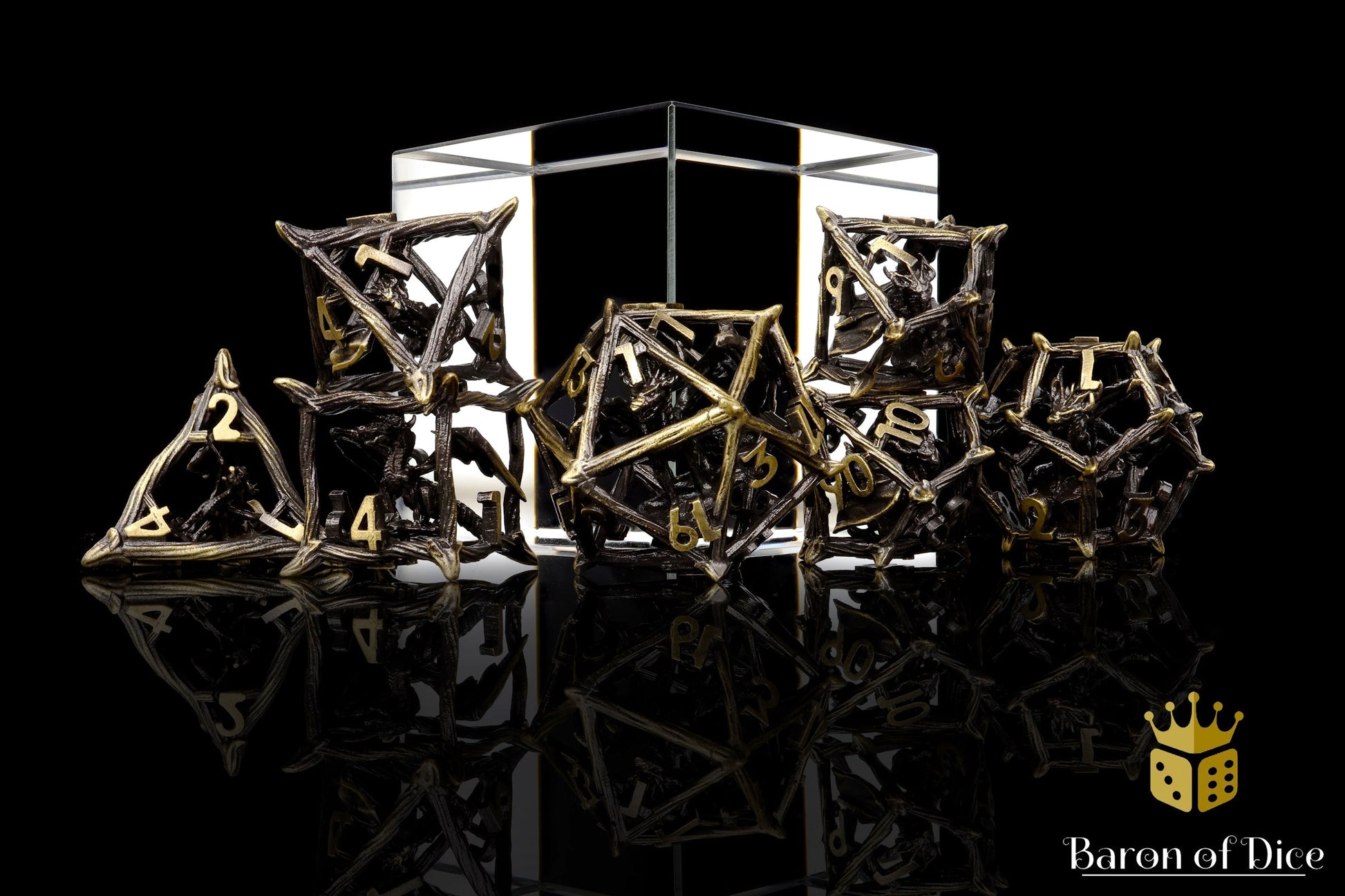 This set is made from hardened dragon steel, burnished by flame. Featuring miniature dragons embedded across each die, these are ready to reign from the skies; premium metal 20mm dice set containing D4, D6, D8, D10, D10, D12, and D20.