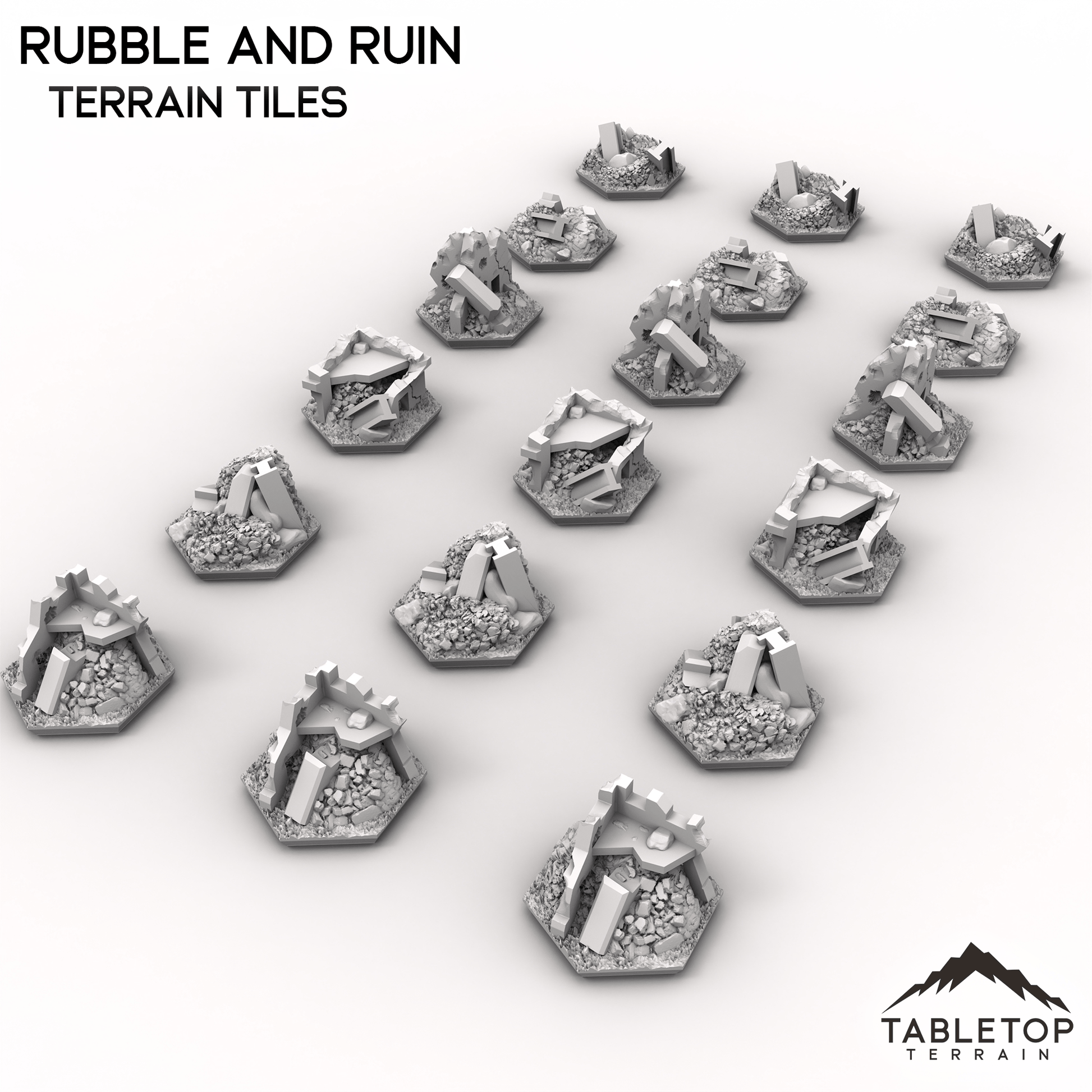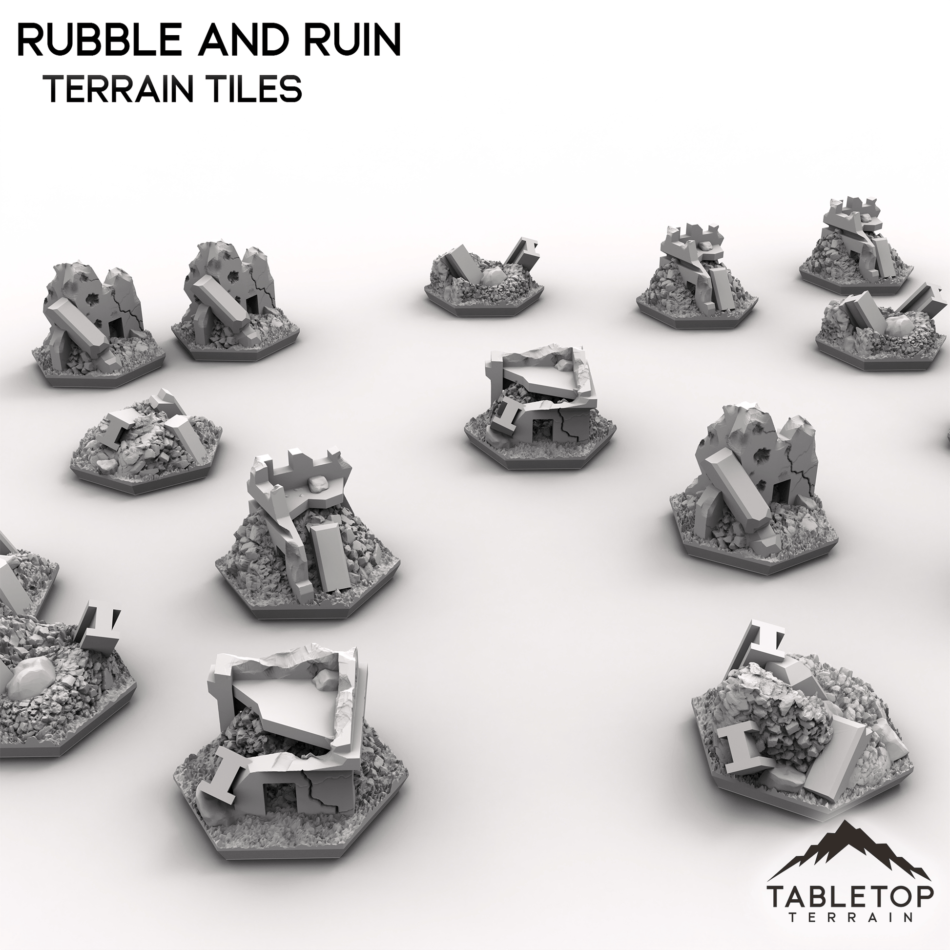 Rubble and Ruin Terrain Tiles - 18 Terrain Tiles including 3x Rubble A, 3x Rubble B, 3x Rubble C, 3x Ruins A, 3x Ruins B, 3x Ruins C.