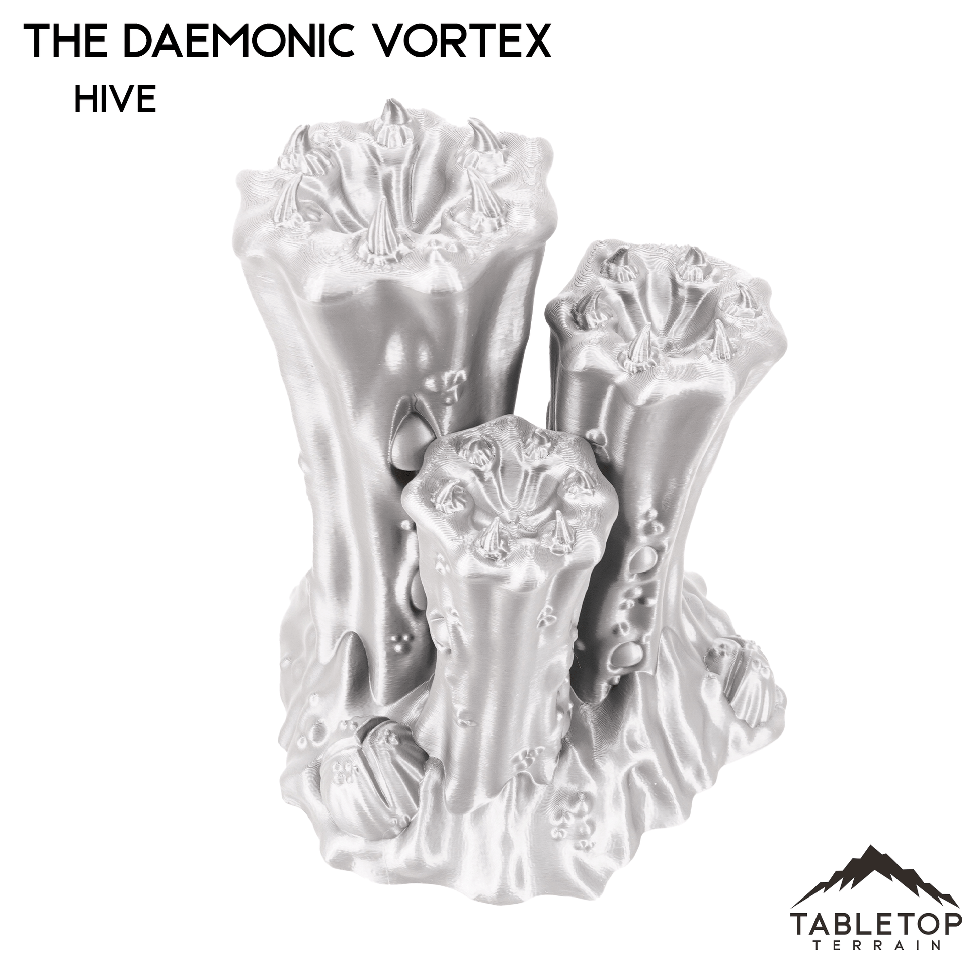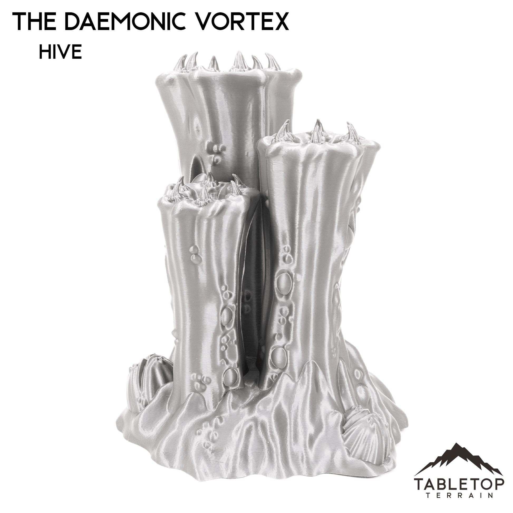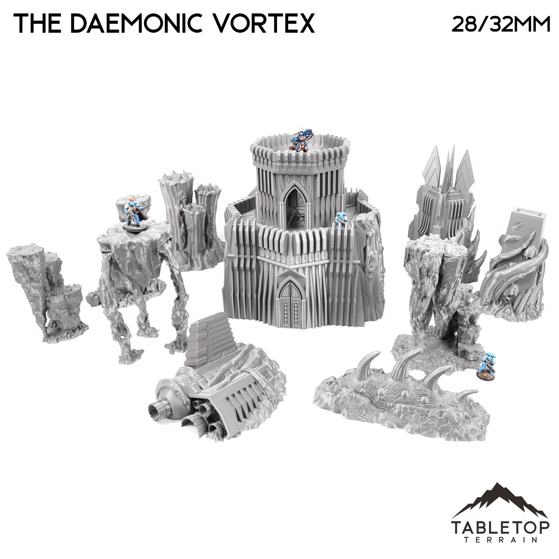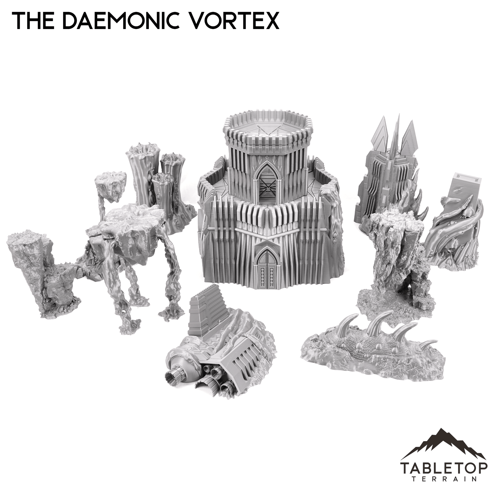 This Grimdark table set represents Chaotic Demon wasteland ruins. It has many unique pieces that work well together for a full battlefield. The full set fills up a 6x4 table with a lot of dynamic terrain elements including large line of sight blocking on the taller structures. Each item is available individually but if you purchase the full set it includes a built in discount.