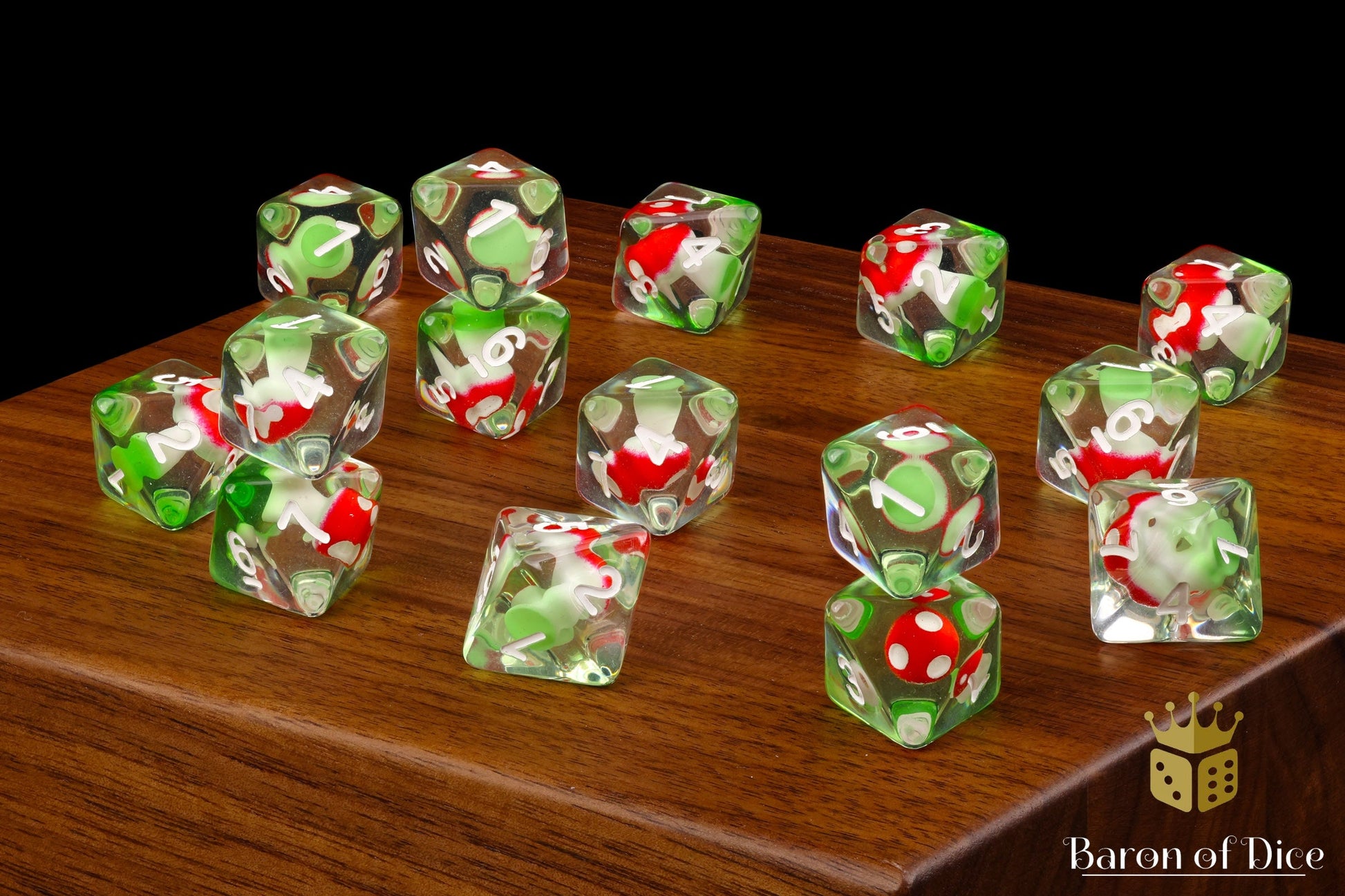 These contain a base of translucent clear with strands of green grass and a resin crafted red mushroom inside!  These are inlaid with a pure white, resin D8 dice. There are no symbols, each tube contains x15 D8 dice. Our premium dice now come in a unique reusable tube.
