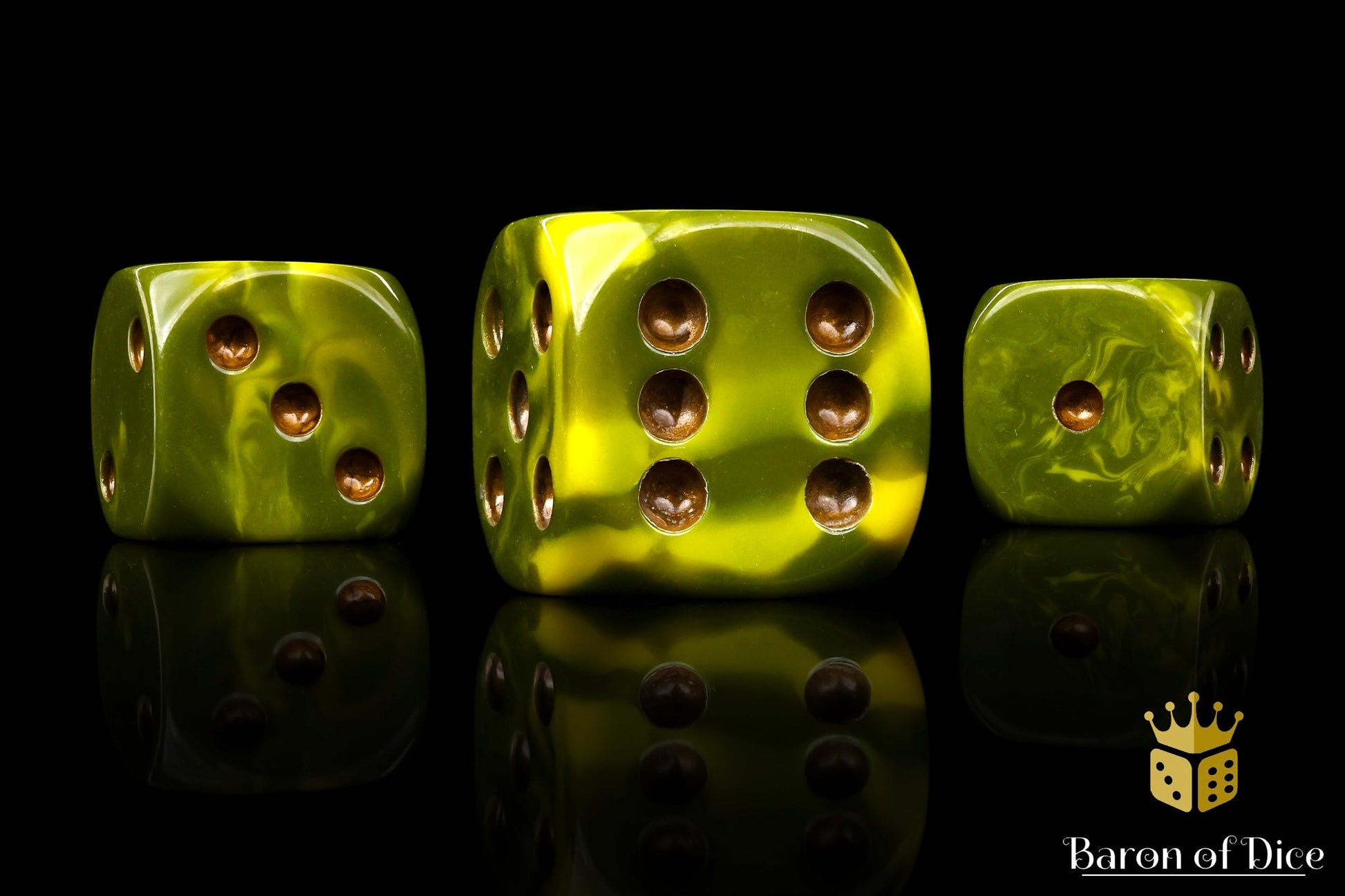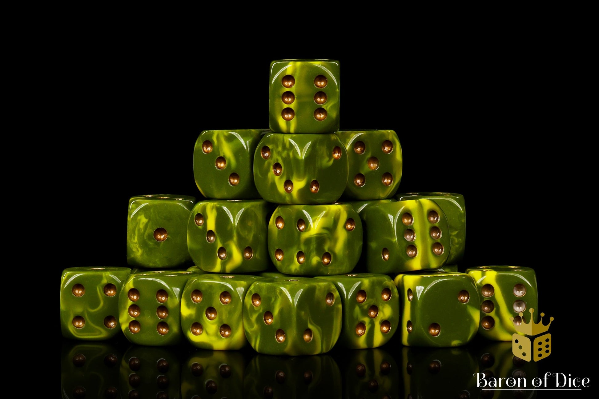 These contain a mix of foul greens straight from the cauldron swirled with sinewy, virus infused yellows and inlaid in the rankest copper; resin 16mm dice. The symbols are on the 6 side. These dice have an option of round or square corner, choose wisely! Our premium dice now come in a unique reusable tin.
