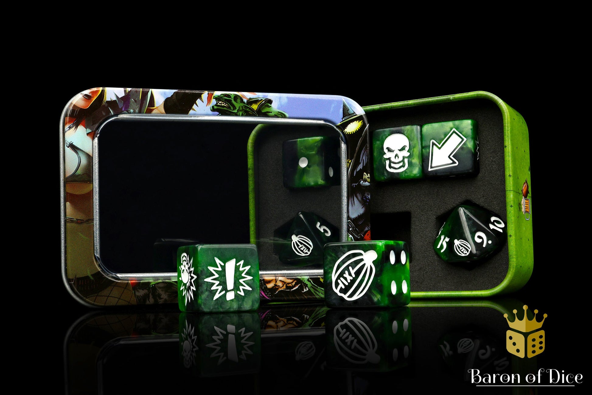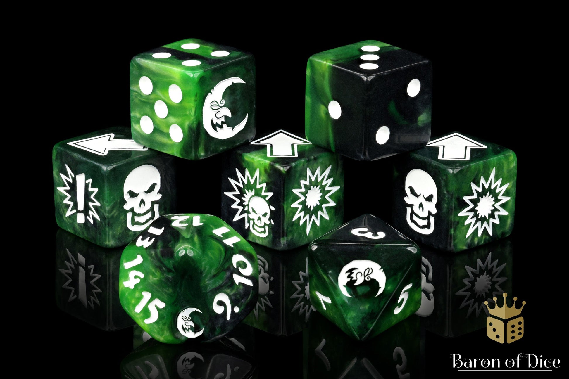 Our premium hand swirled resin dice contain energized green hues swirled with veins of pure black and inlaid with a crisp white. All symbols are on the 6, 8, and 16 sides, please choose a design to complement your army!