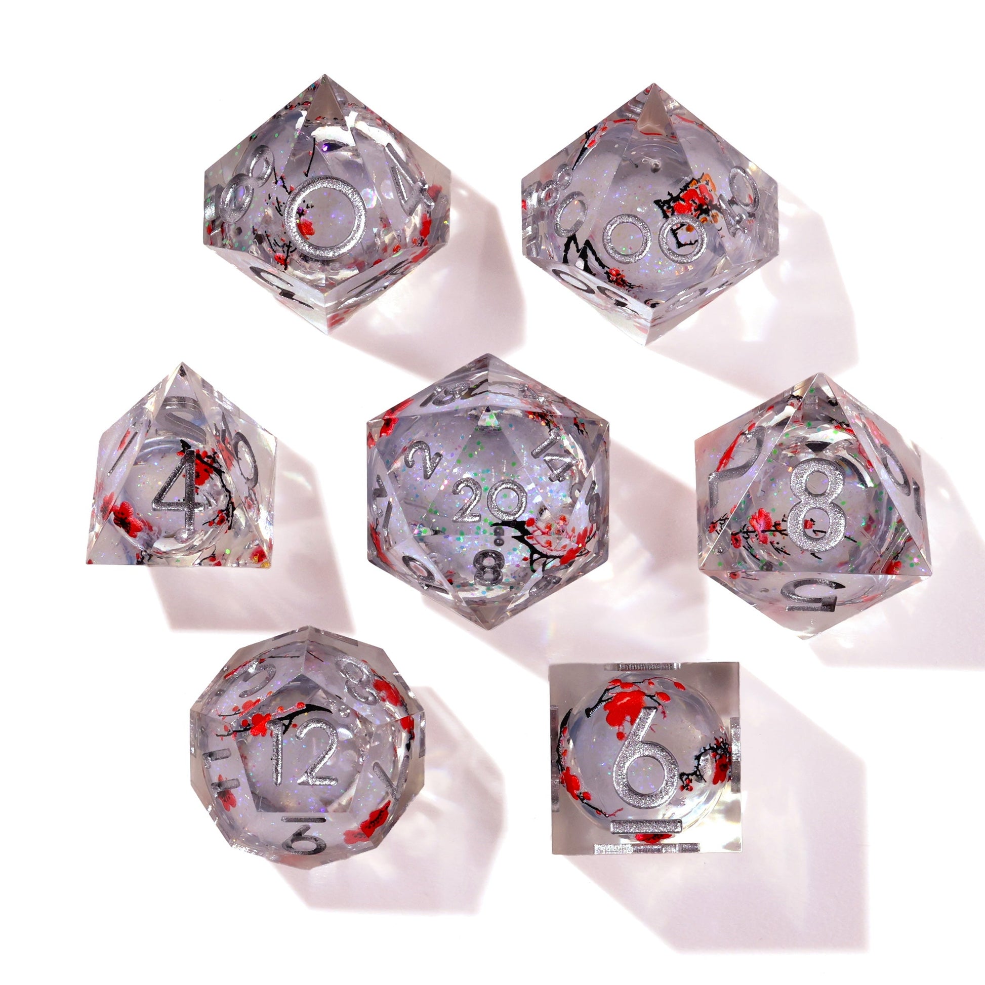 This set replicates the freshly laid powder of falling snow within a blossoming cherry orchid with each roll. Featuring a liquid core, with white snow glitter captured within each die! The dice are hand polished sharp corners, unique amongst our collection. They are a clear translucent with etched cherry blossoms and inlaid with a metallic silver; premium hand-mixed resin 16mm dice set containing D4, D6, D8, D10, D10, D12, and D20.