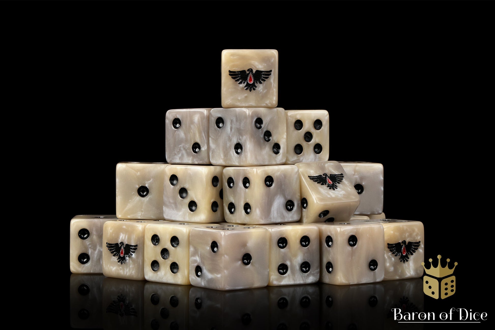 These contain a mix of freshly cracked bone swirled with a worn cream and inlaid with a two-toned blood red and pure black; resin 16mm dice.  The symbols are on the 6 side.  These dice have an option of round or square corner, choose wisely! Our premium dice come in unique reusable tins.