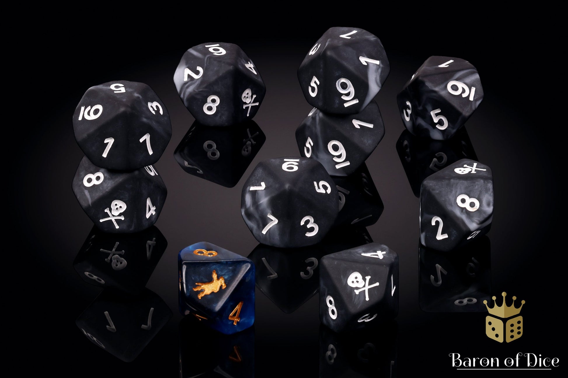 Pirates feature a matte black swirled with silver veins and inlaid with a pure white; resin 16mm dice. All dice are accompanied in a sweet metal tin surrounded by EVA foam. Show up in style!