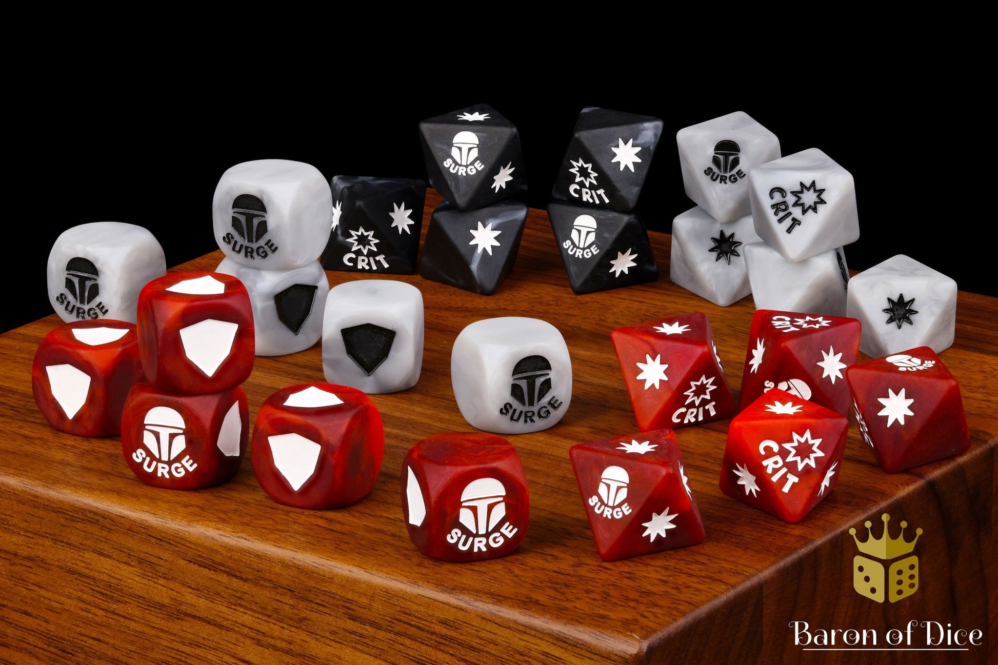 In a faraway galaxy, a war rages through the centuries. Where do your loyalties lie? This set of premium hand-mixed resin dice have a matte finish, which is perfect for the camera or brightly lit areas, each die features unique symbols.