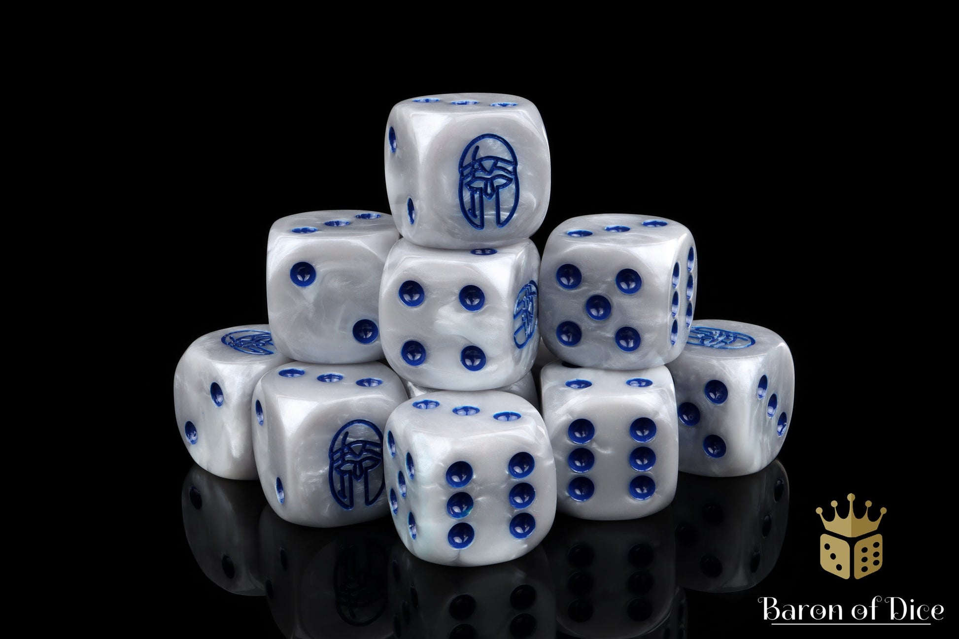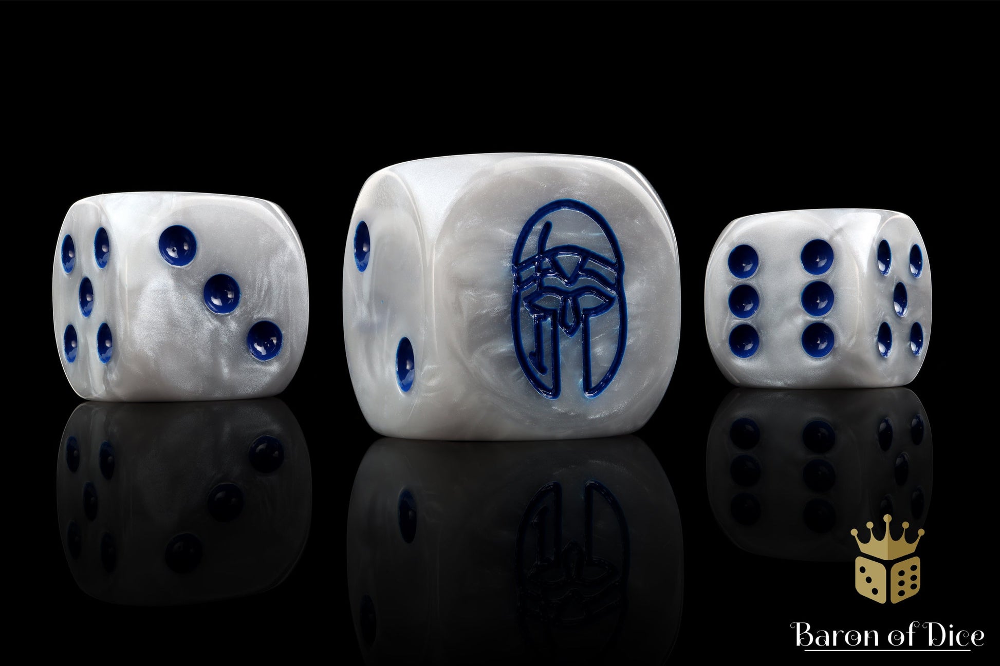 These contain a mixture of ancient marbles swirled with alabaster greys and inlaid with a loyal blue; resin 16mm dice. The symbols are on the ONE side. Yes, the ONE side.