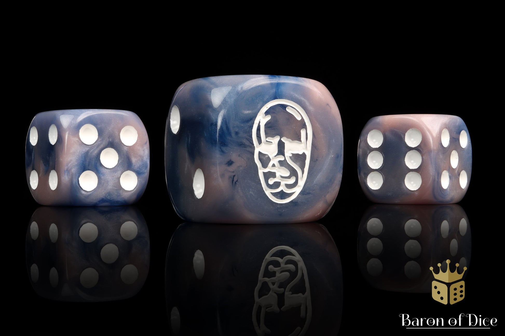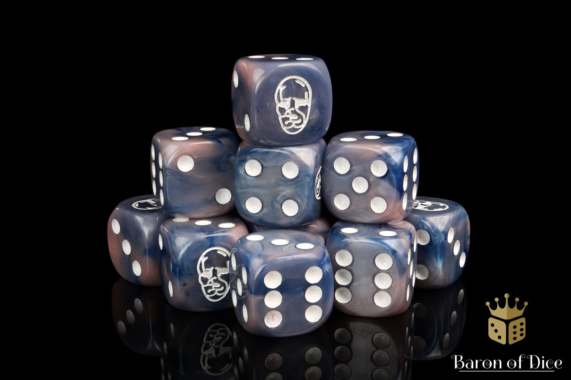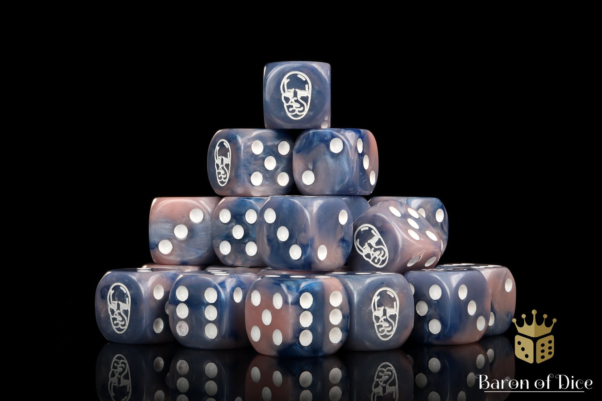 Ready to empty the vats and march for war! These contain a mix of cloned fleshy hues swirled millennia old blues and inlaid with an easily readable white; resin 16mm dice. The symbols are on the ONE side. Yes, the ONE side.