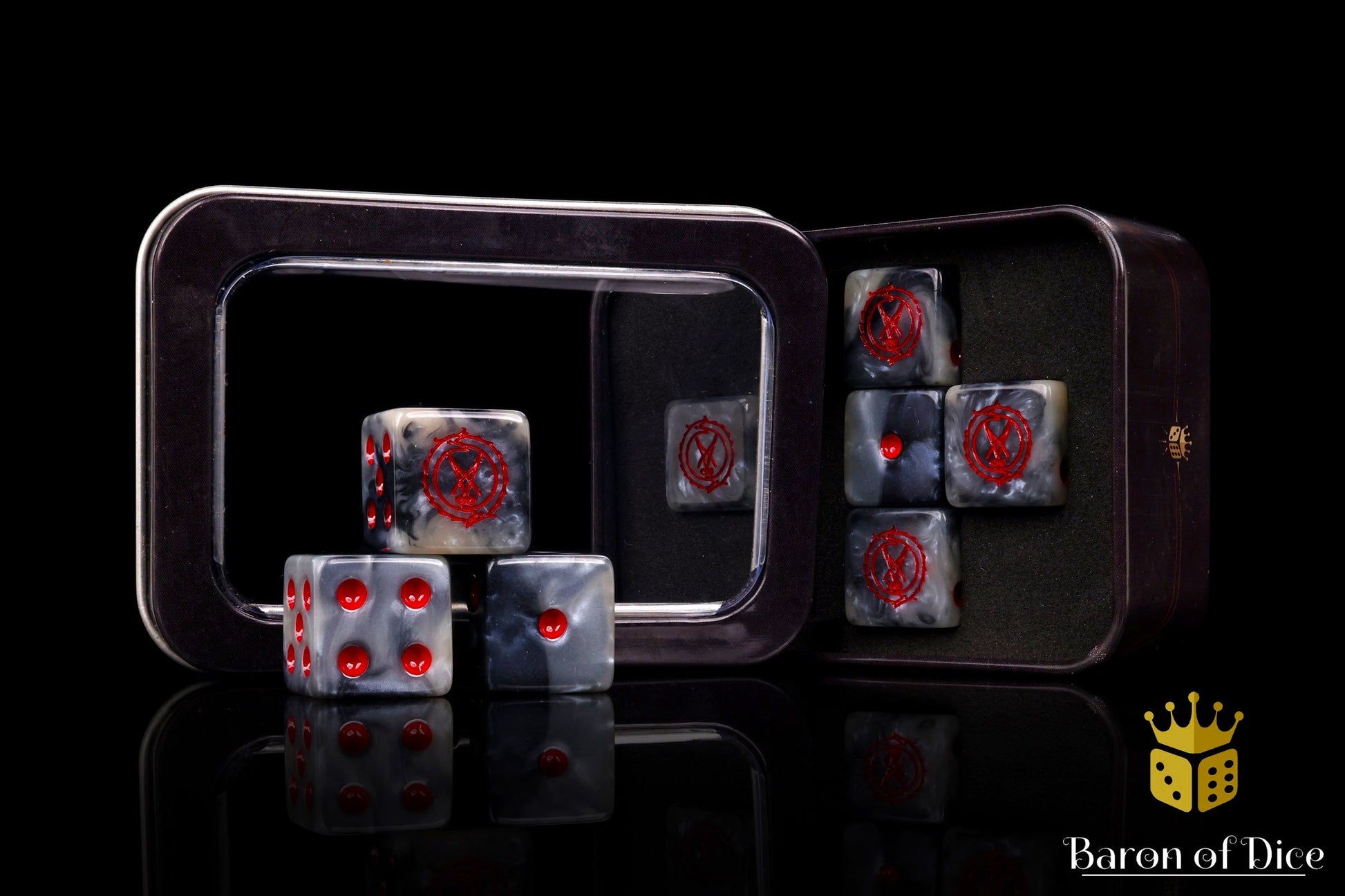 These Court of the Seven-Headed Serpent officially licensed dice sets contain a mix of a sorcerous grey swirled with black and silver ritual hues and inlaid with a bright blood red. Our set of x8 dice comes inside a unique reusable metal tin.