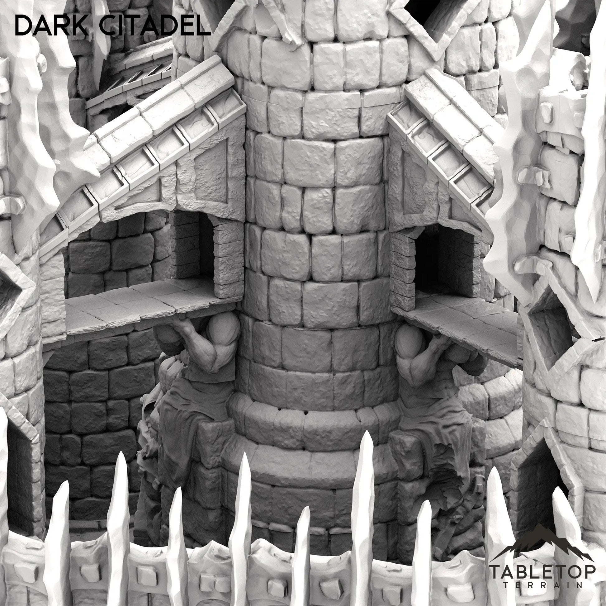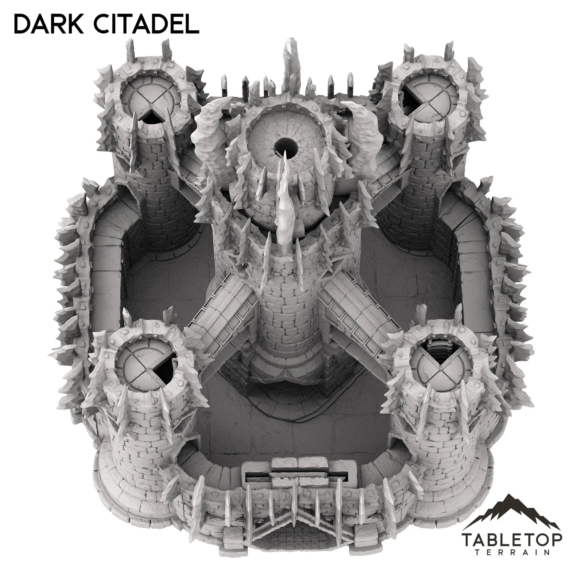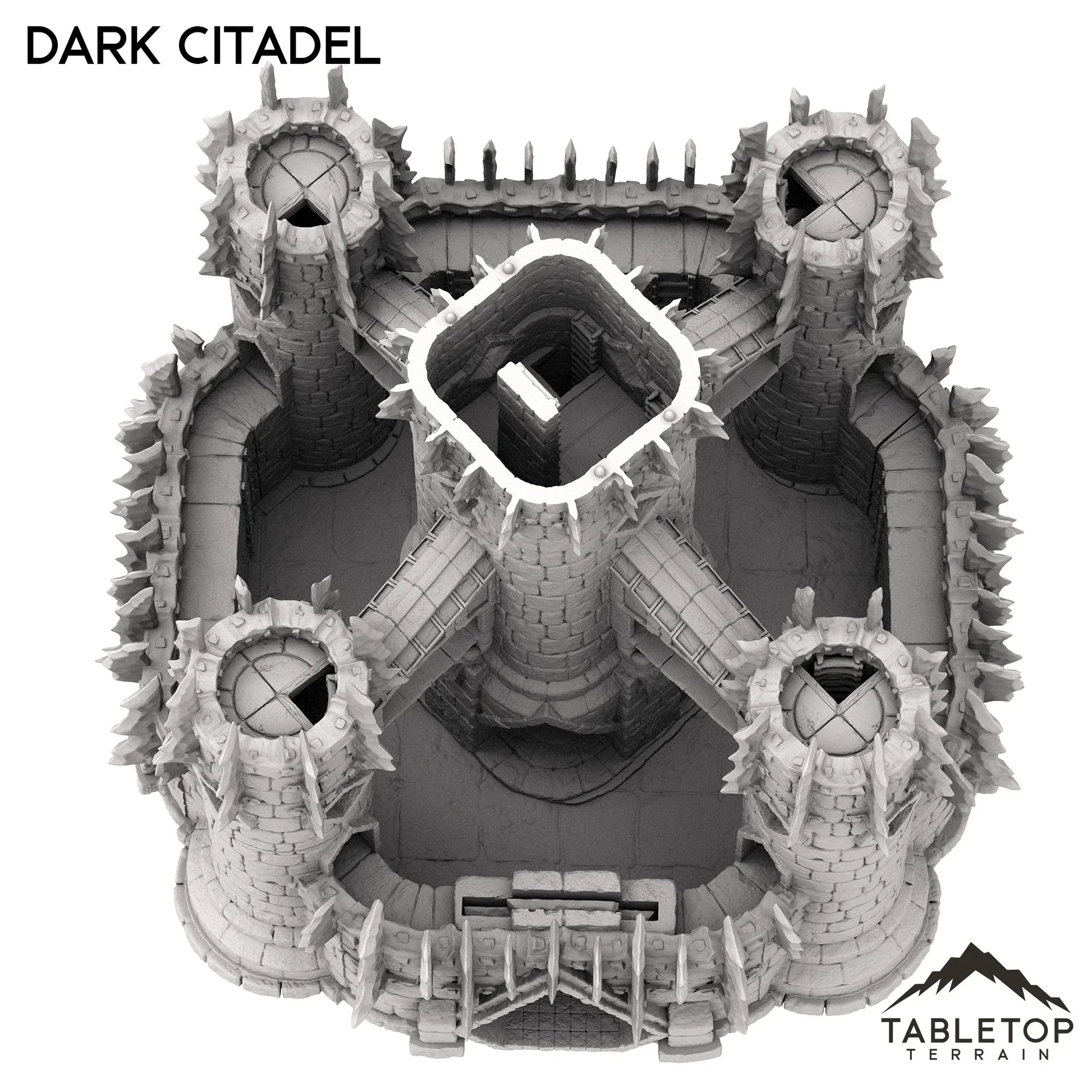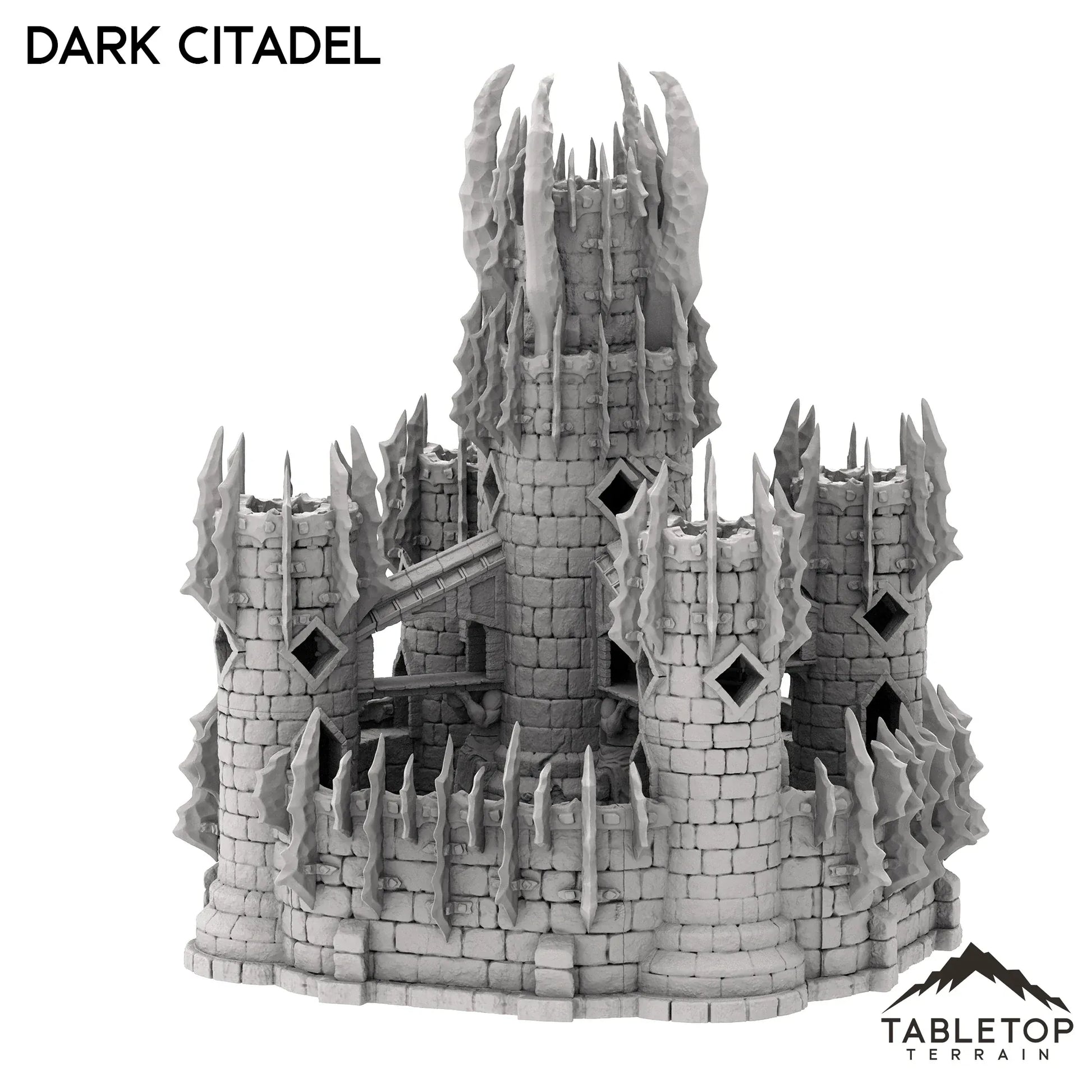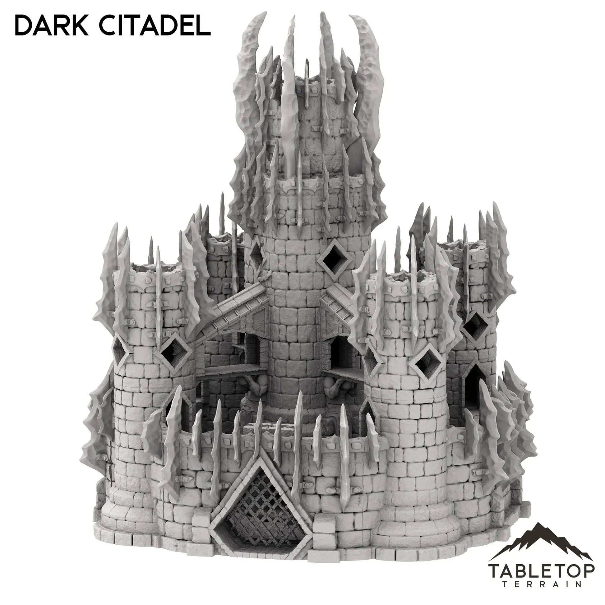 The Dark Citadel is a massive multi-story castle with plenty of options for exciting engagements. A wall with battlement spans the whole castle, protected by a removable large gate to open and close the structure. Each level of the tower removes and has room for miniatures inside. This citadel is truly a centerpiece.