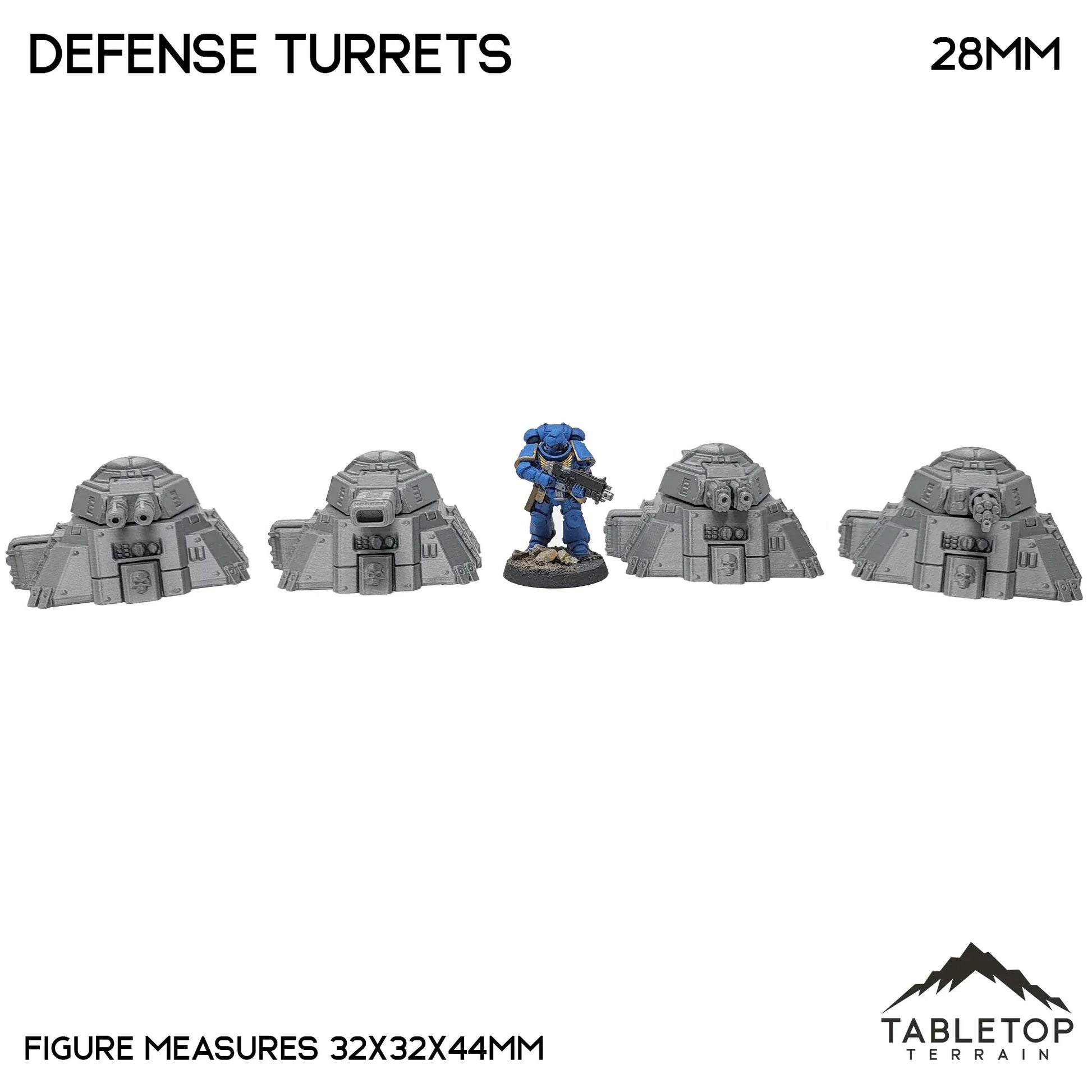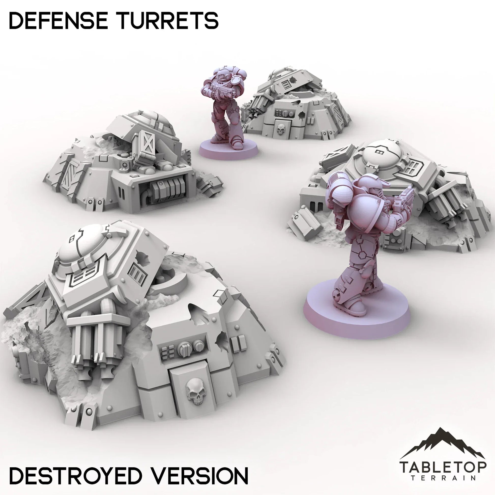 The Defense Turrets is a set of four small defense turrets with articulating turret heads. It comes with all four gun options- assault cannon, bolter, laser and plasma. They require assembly, but have a peg and groove system to aid with gluing.