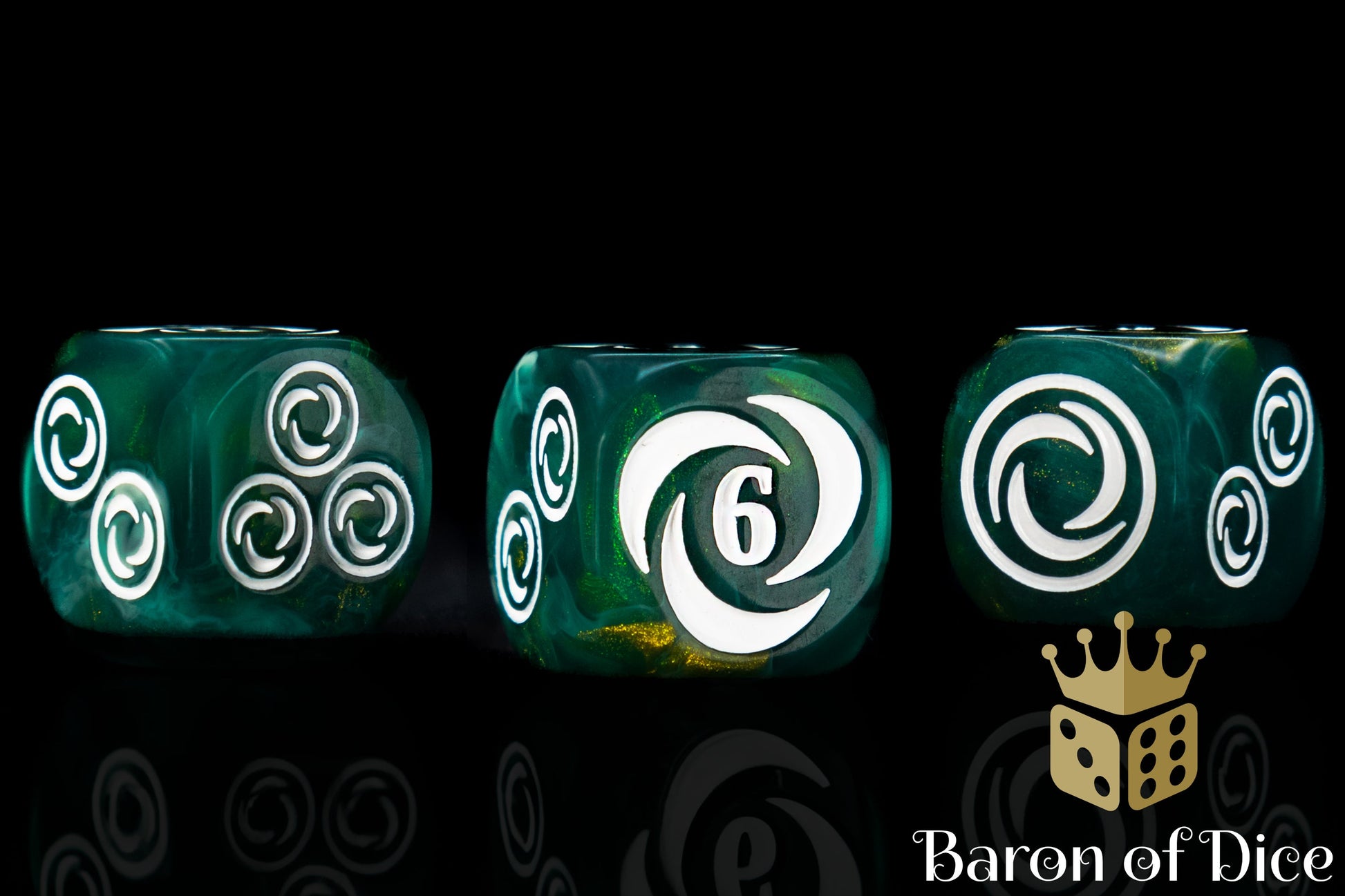 Elevate your gaming experience with the Baron Dice Resource Dice, allowing the purchase of single resource dice. Each single resource die is a pearlescent dark green swirled with golden mica powder and inlaid with a pure white.
