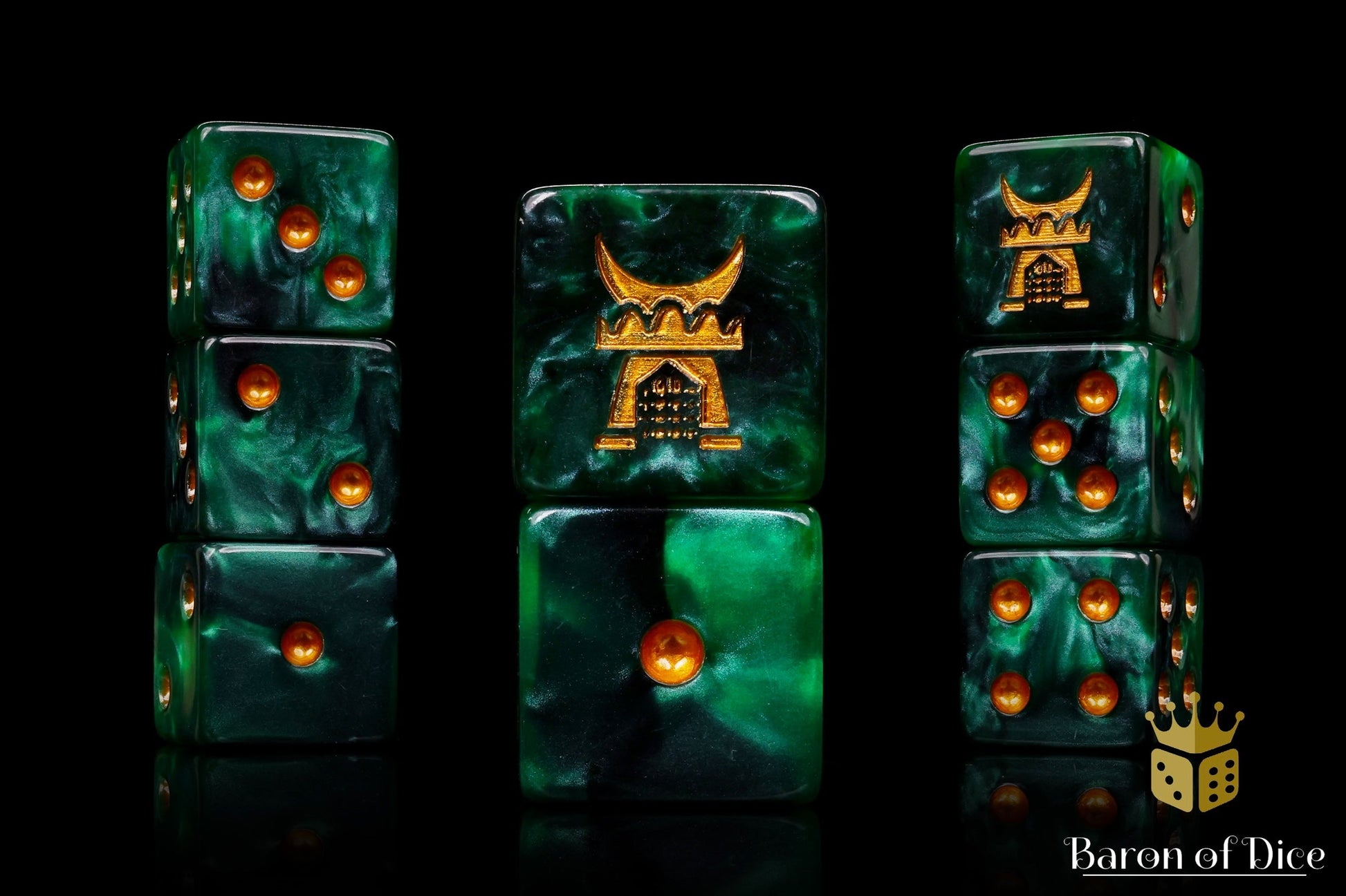 These Iron Sultanate officially licensed dice sets contain a mix of a righteous greens swirled with black veins and inlaid with metallic gold. Our set of x8 dice comes inside a unique reusable metal tin.