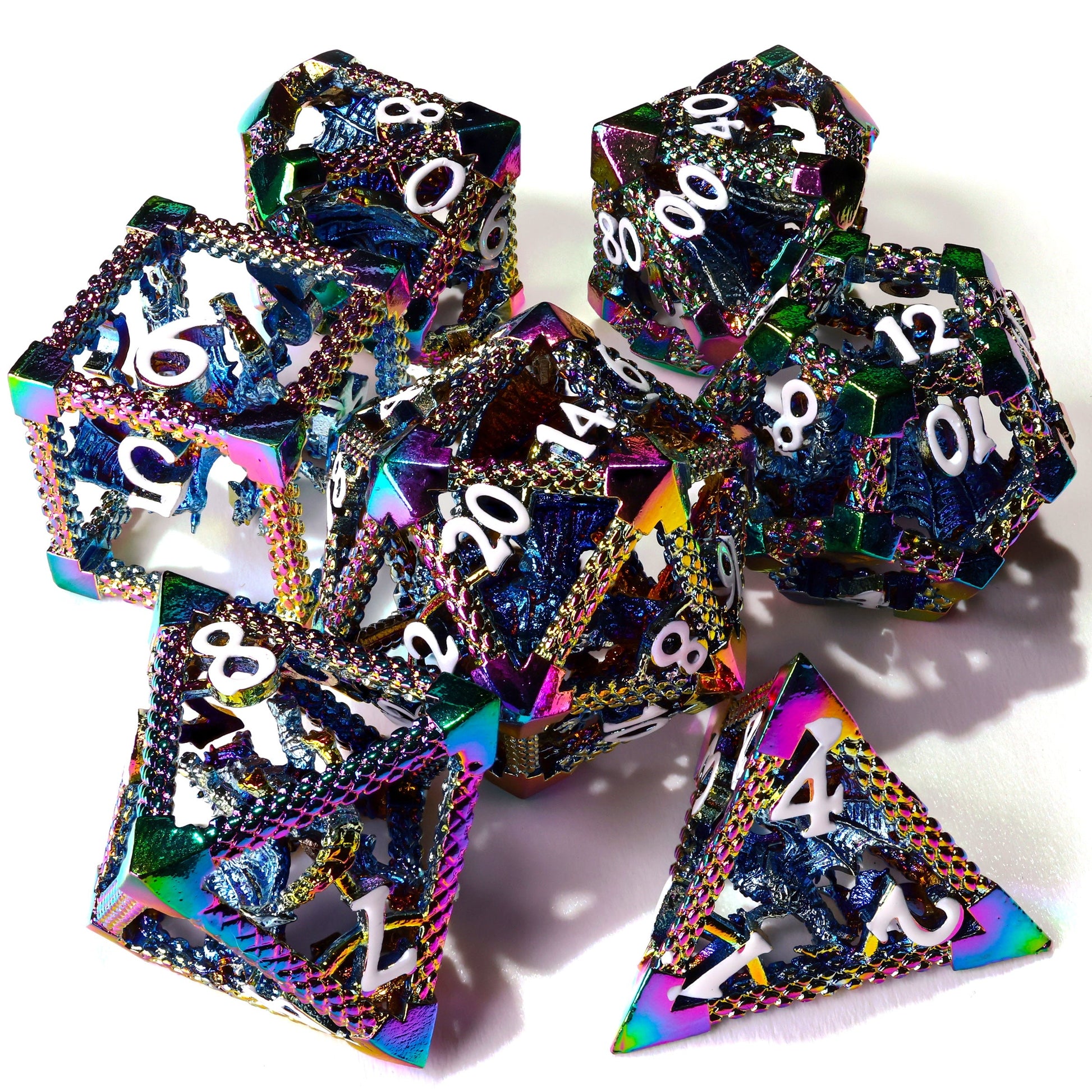 This set is made from iridescent dragon steel, oiled to a shimmering rainbow. Cut from Earth's veins, these metal dice are ready to blow your mind! Featuring miniature dragons embedded across each die, in iridescent steel, these are ready to roll from the skies; premium metal 20mm dice set containing D4, D6, D8, D10, D10, D12, and D20.