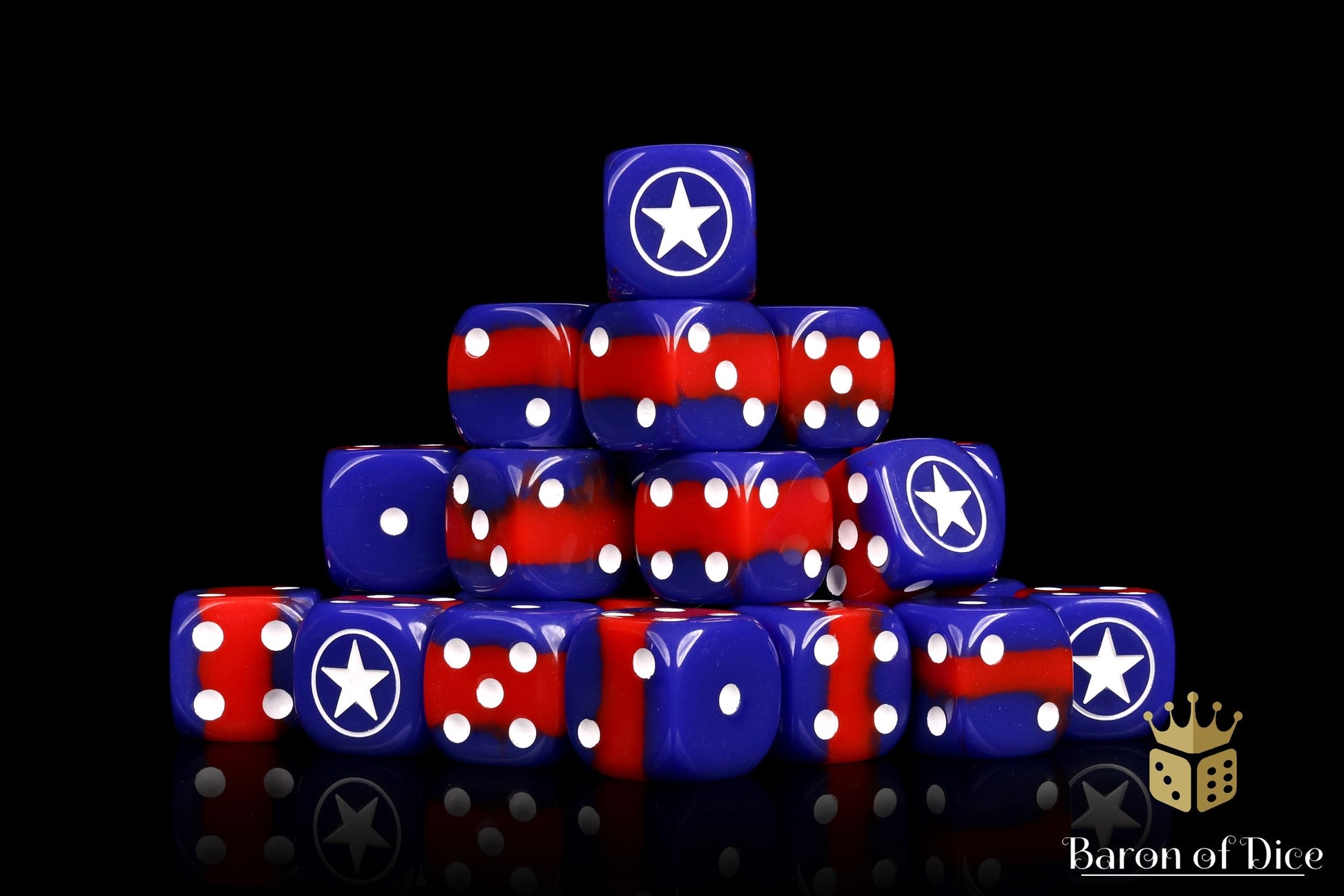 These are hand layered resin dice, combining two colors layered like the North Korean flag. Featuring a royal blue and bloody red and inlaid with a pure white; resin 16mm round edge dice. The symbols are on the 6 side. Our premium dice come in metal reusable tins when purchased in x25 and x50 count quantities.
