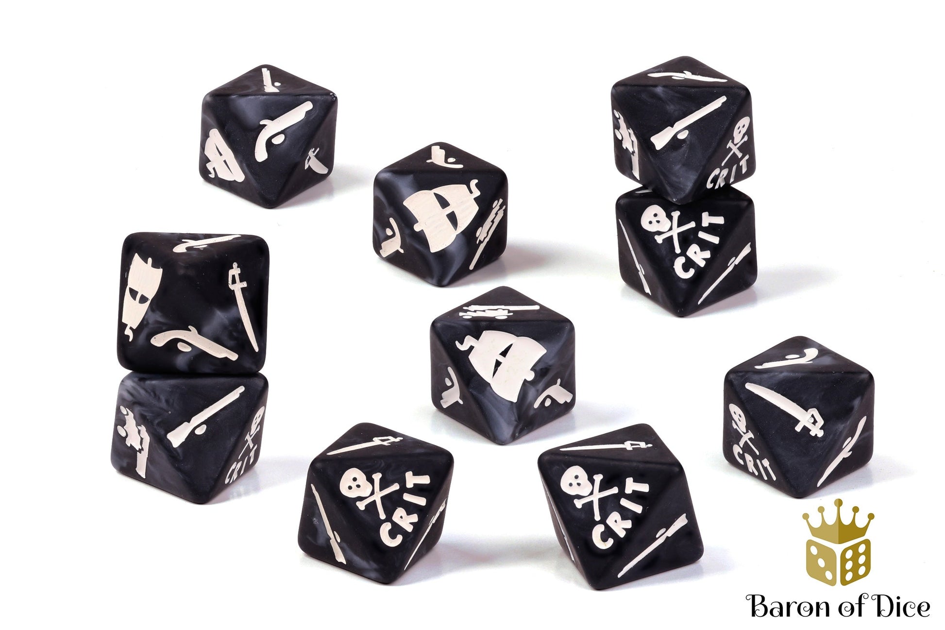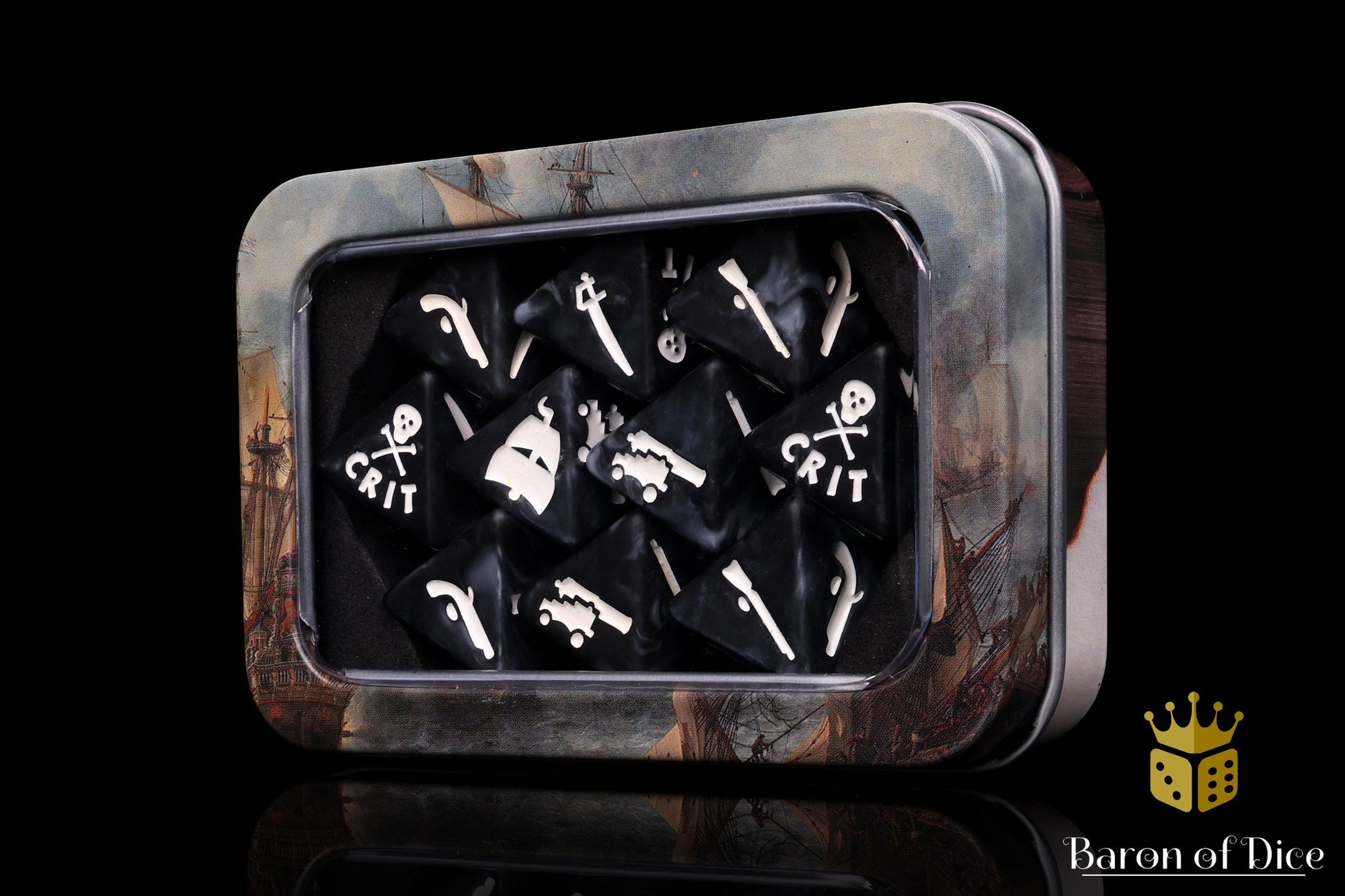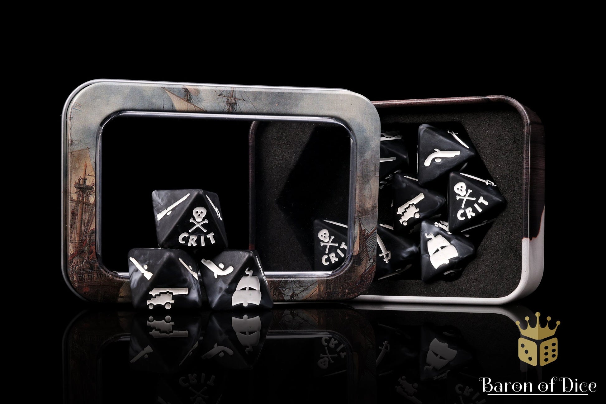 Pirates feature a matte black swirled with silver veins and inlaid with a pure white; resin 16mm dice. All dice are accompanied in a sweet metal tin surrounded by EVA foam. Show up in style!