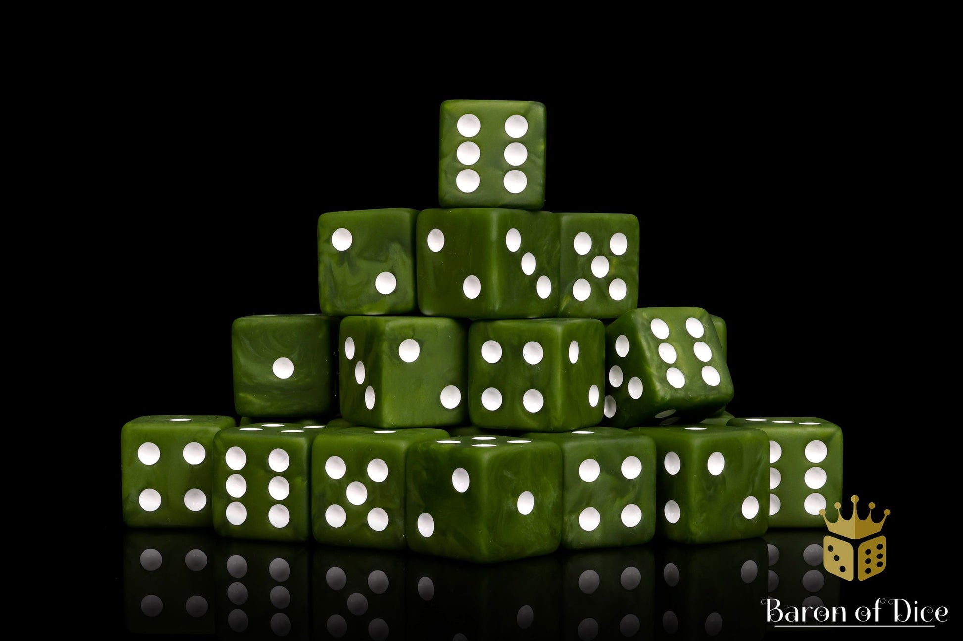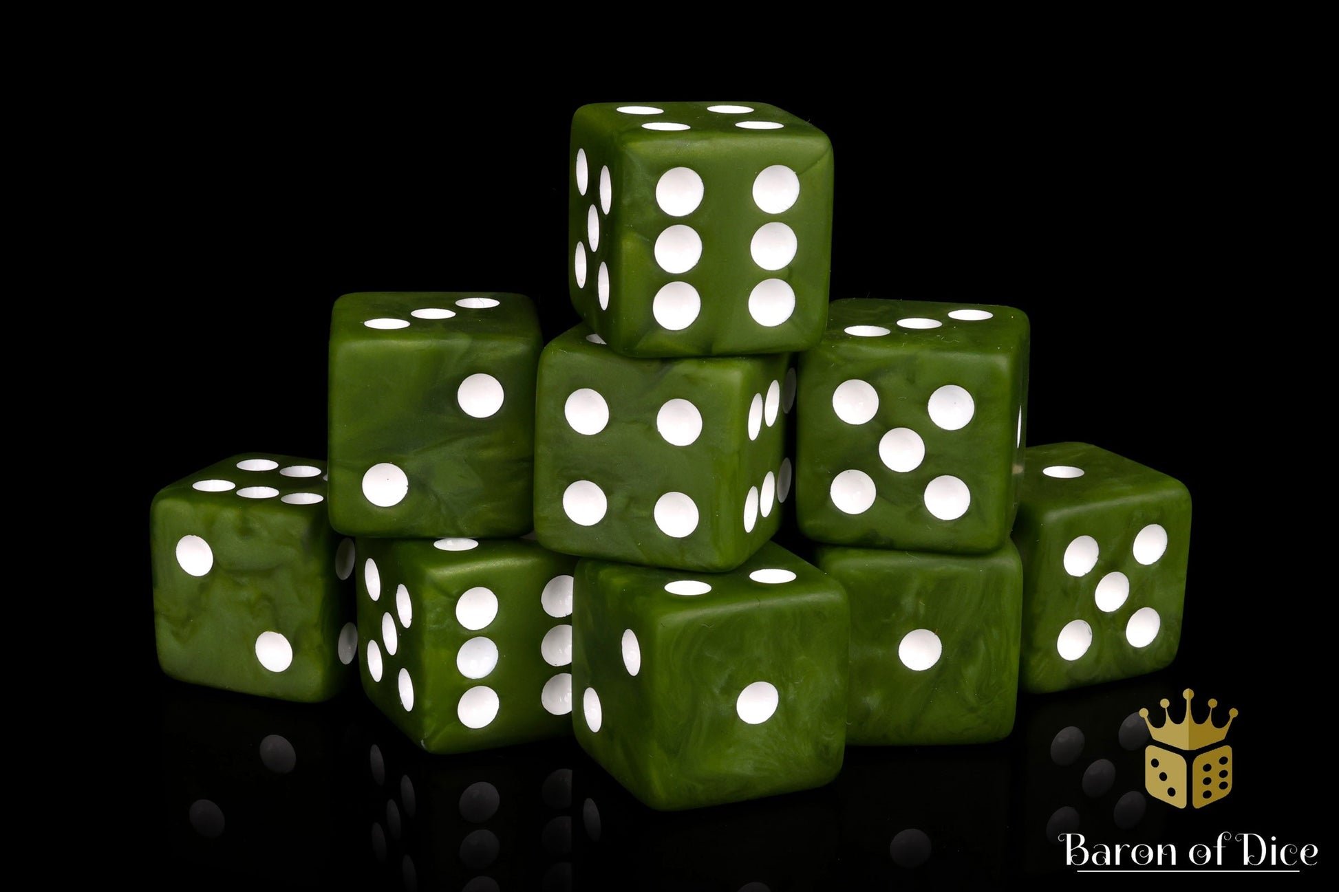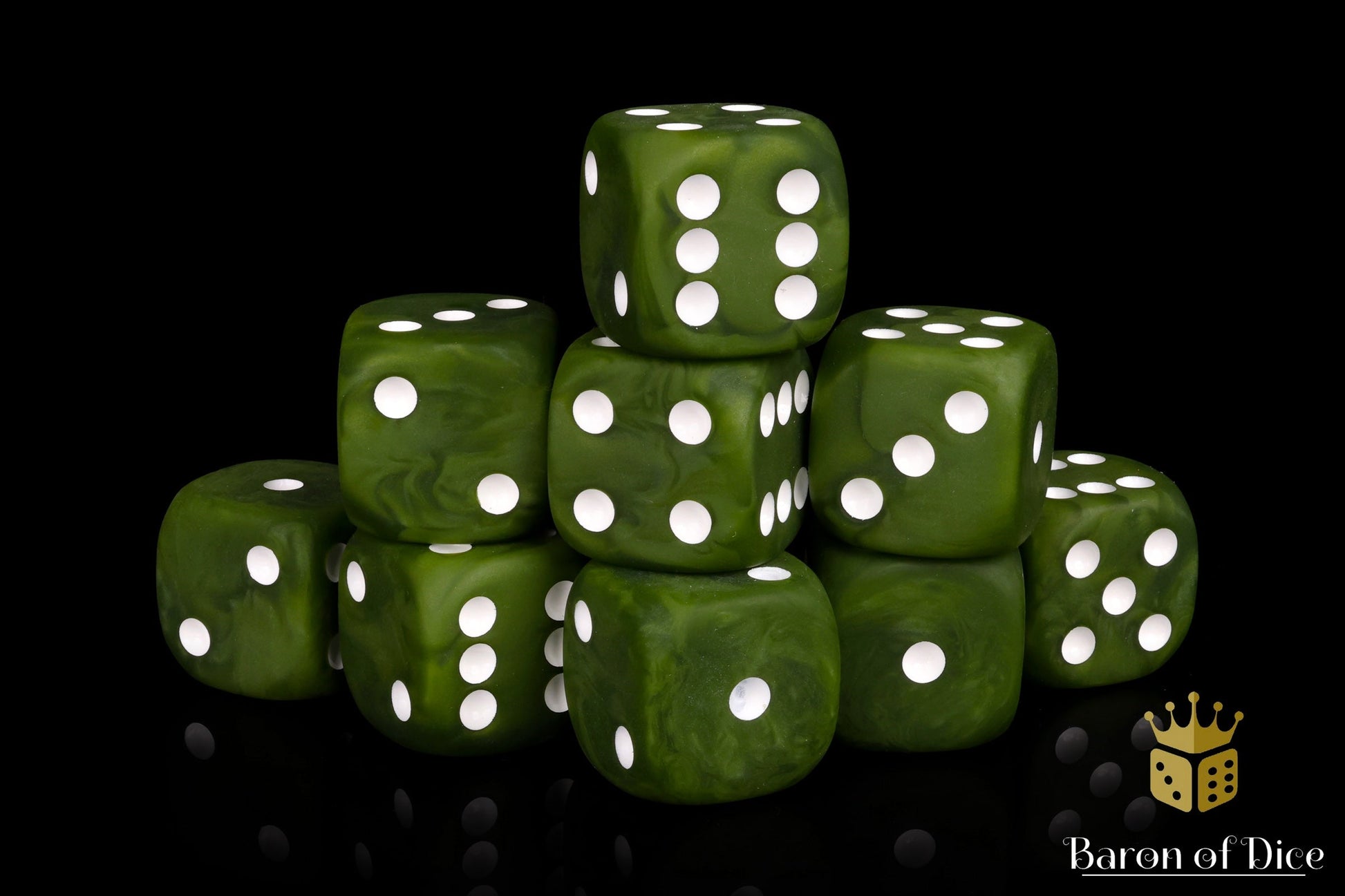 These contain a base of matte olive drab, and forest greens derived from long forgotten technology that does NOT reflect light, and inlaid with a pure white; resin 16mm dice. The symbols are on the 6 side. These dice come in round corner or square corner; choose wisely! Our premium dice now come in a unique reusable tin.