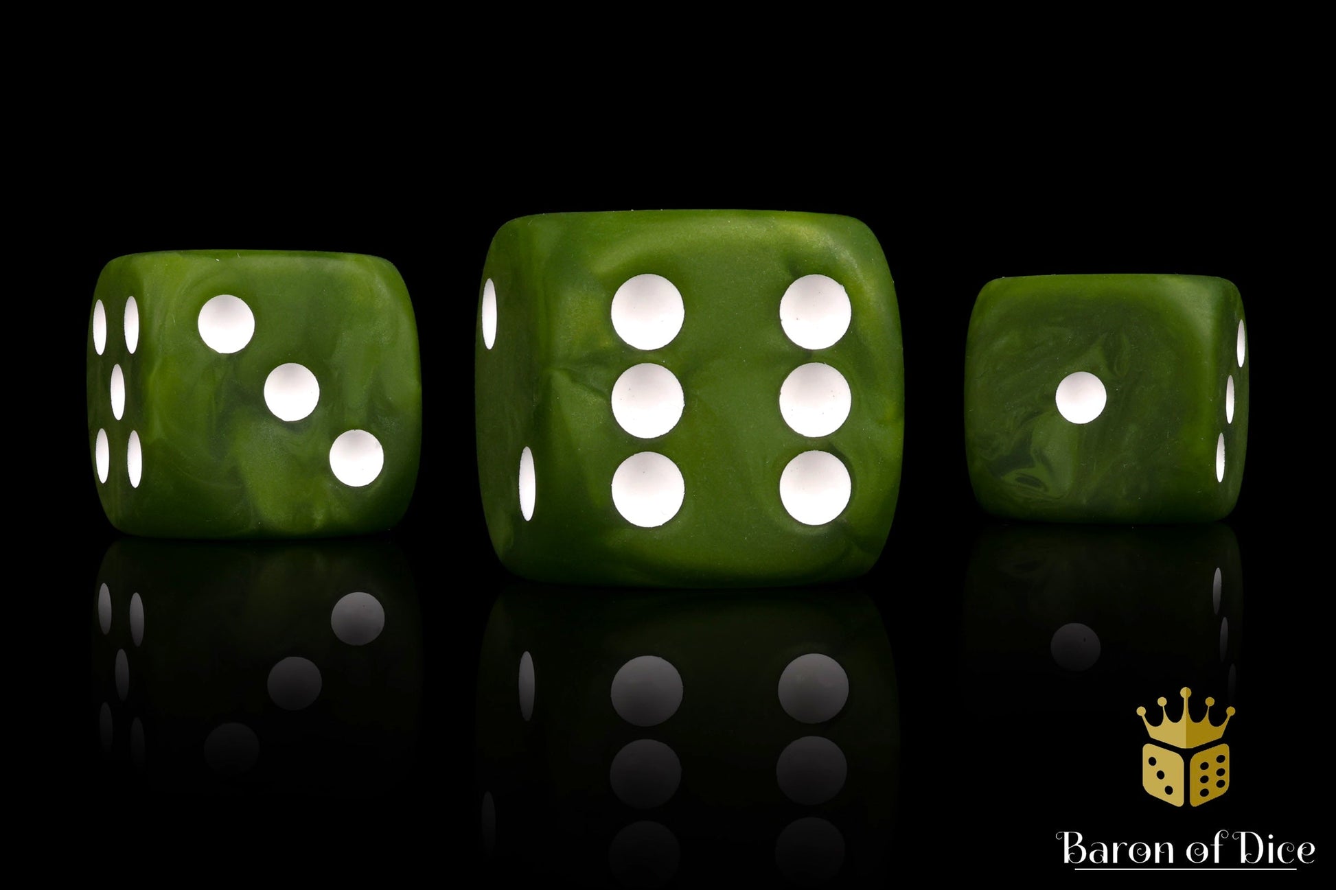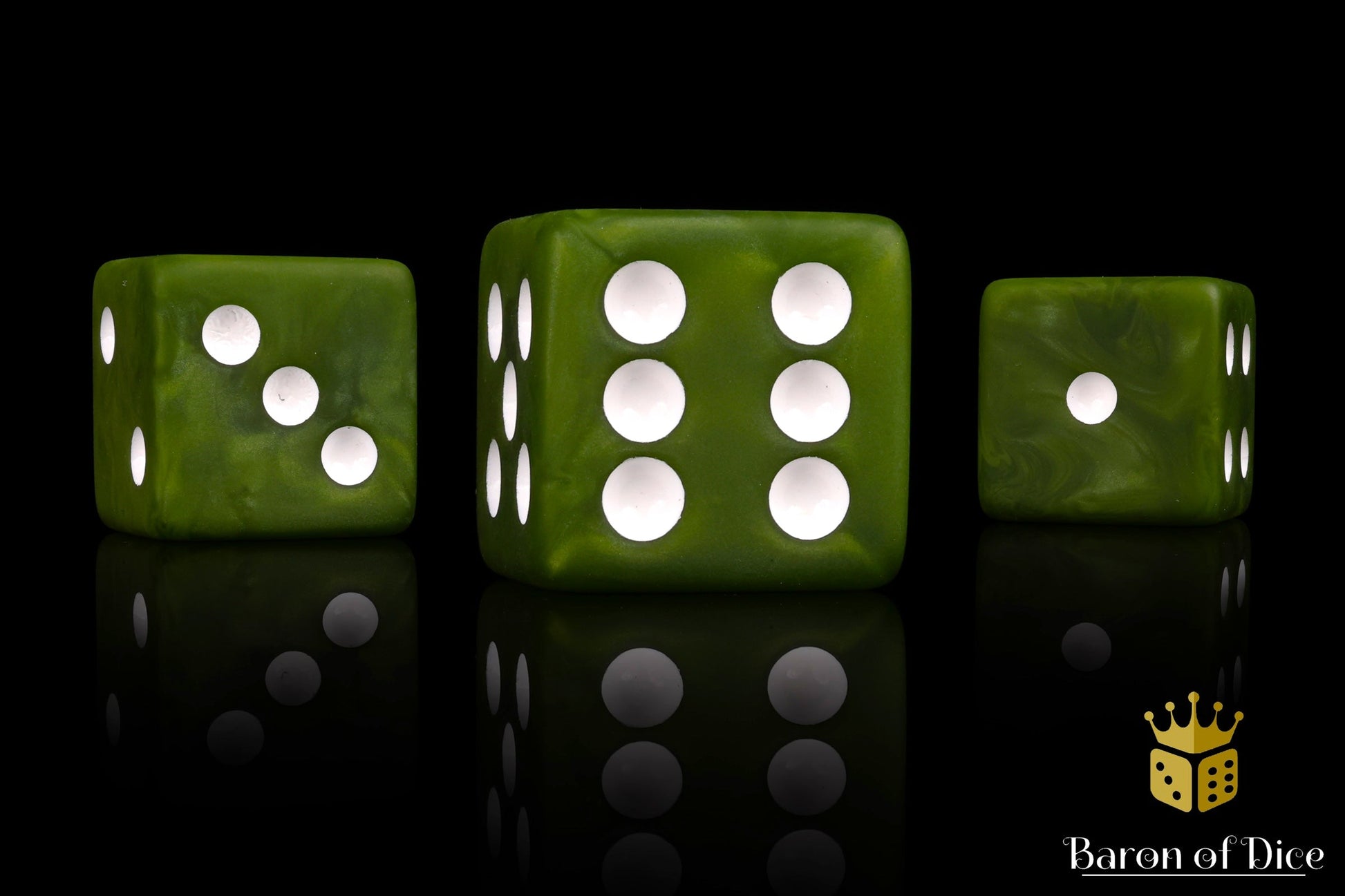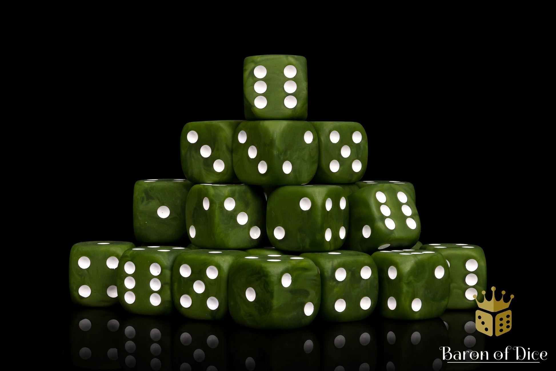 These contain a base of matte olive drab, and forest greens derived from long forgotten technology that does NOT reflect light, and inlaid with a pure white; resin 16mm dice. The symbols are on the 6 side. These dice come in round corner or square corner; choose wisely! Our premium dice now come in a unique reusable tin.