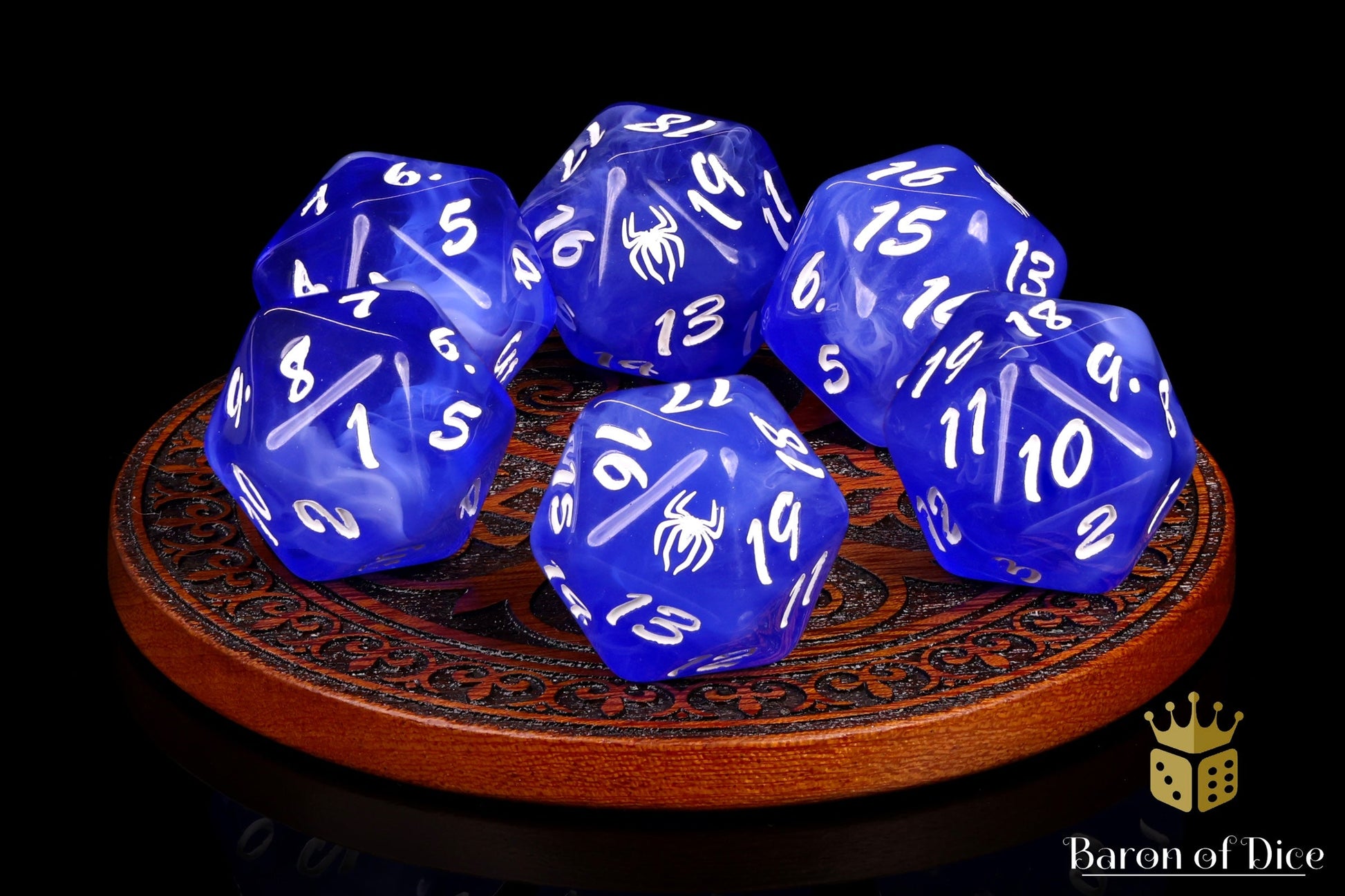 Tired of boring, cheap acrylic counters that claim to be spin downs?! We are! Time to put these vibrant and themed OVERSIZED D20 spindowns on your favorite cards and tokens! Featuring bright blue Lucent with white swirling and inlaid with a crisp white, 25mm, larger than average, D20 modifier dice.
