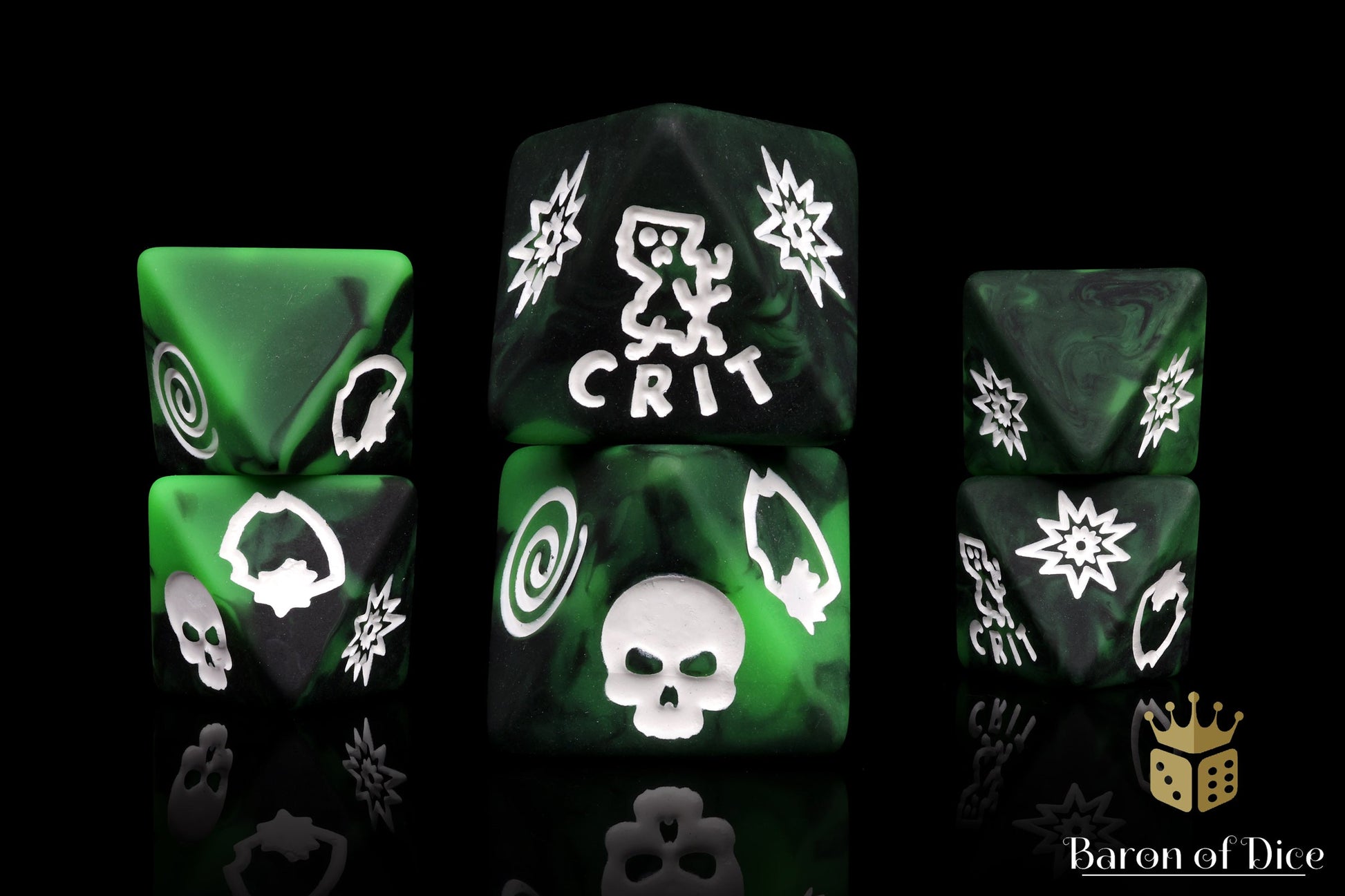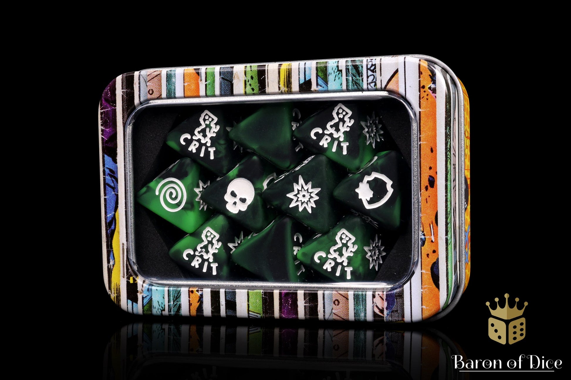 If you know, you know. Nuff' said! These contain an a Jersey green swirled with black, matte finish, and inlaid with a crisp white. The symbols are all unique with a focus on a singular critical die face differentiating the designs. Each set comes with x10 count, D8 dice encased inside an exclusive metal tin.