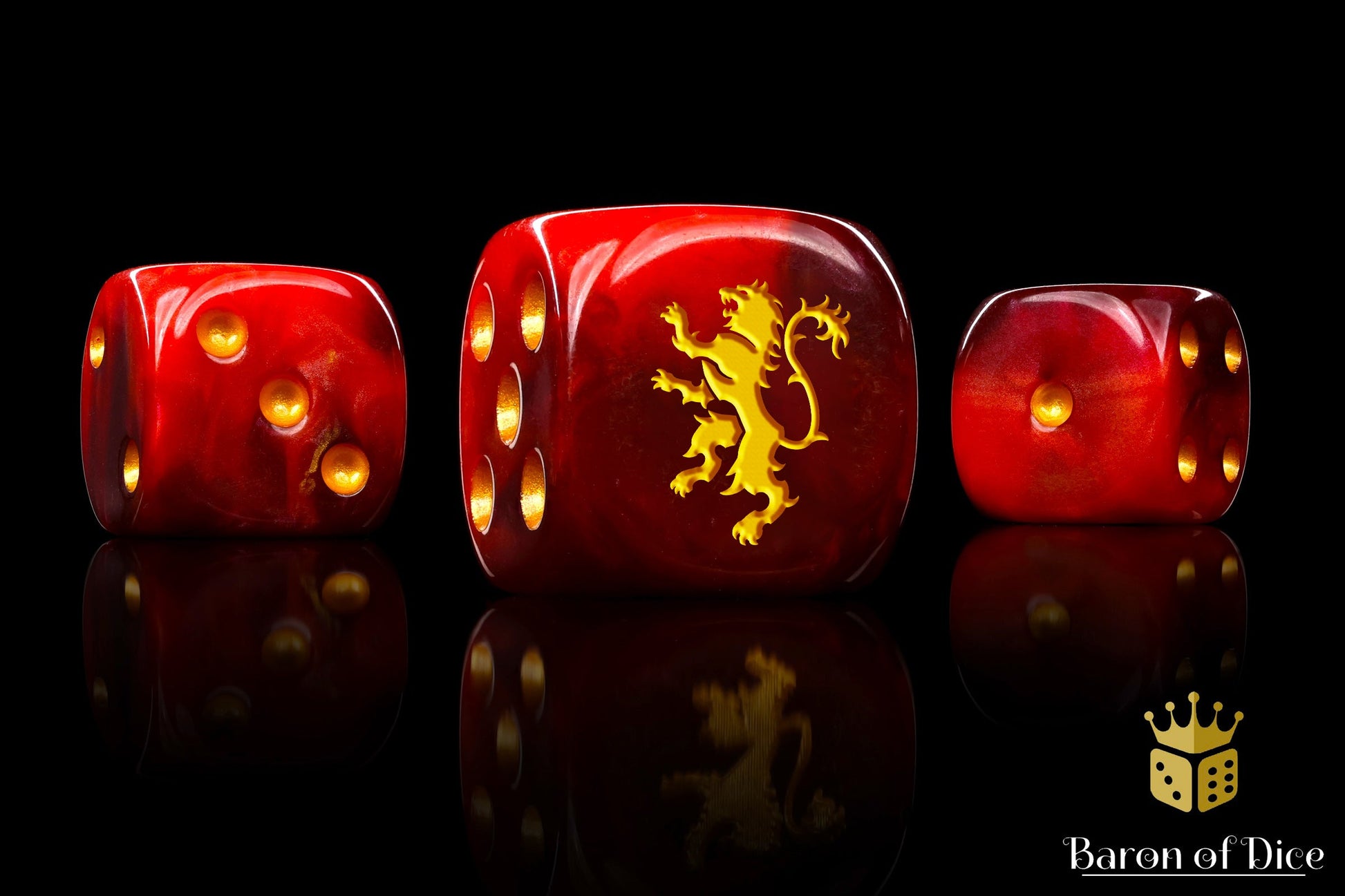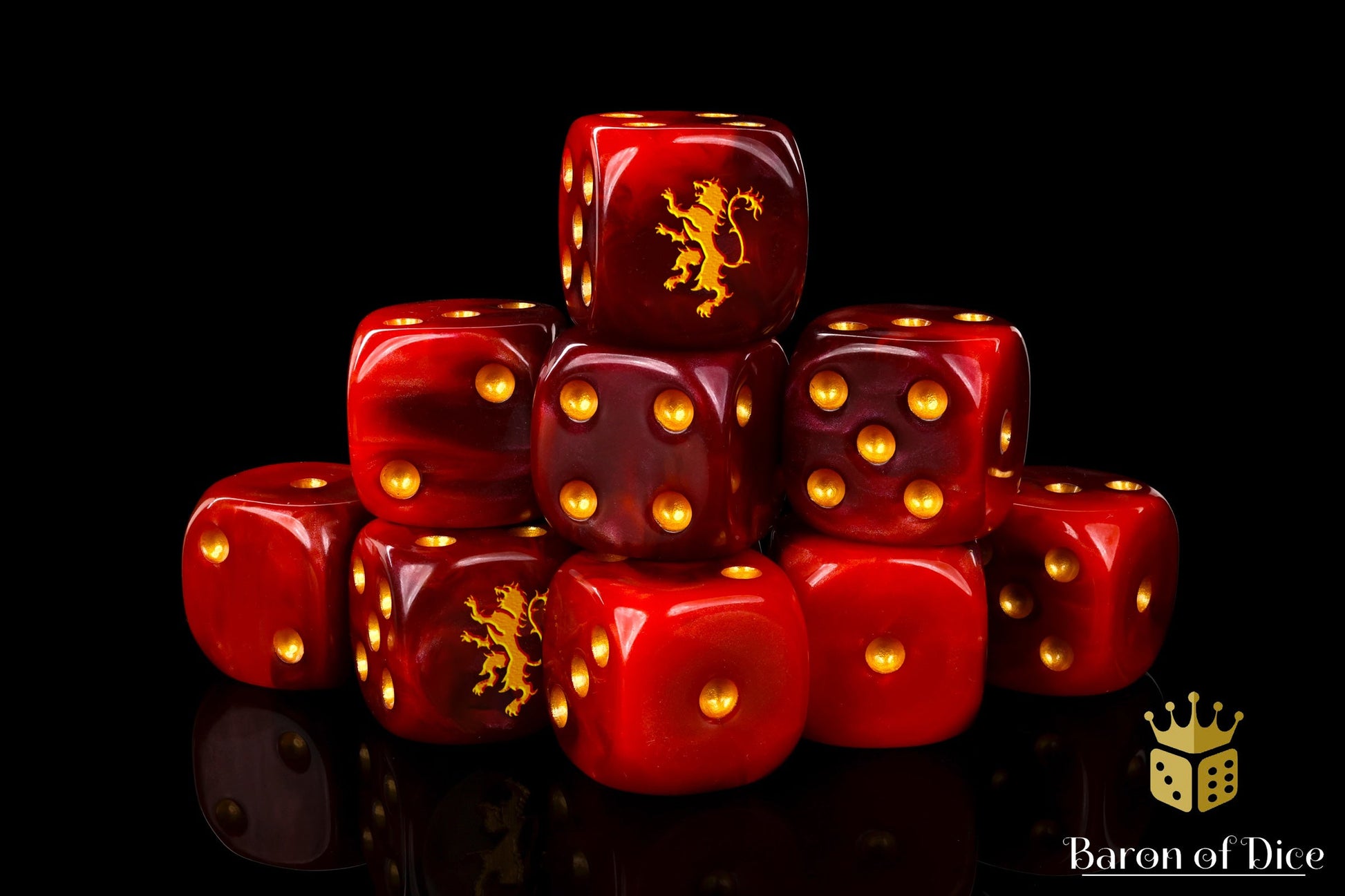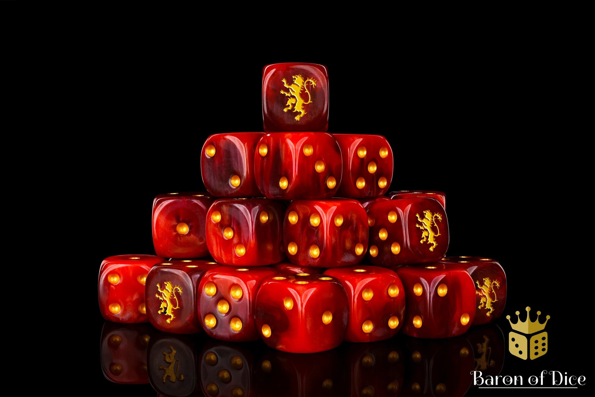 These contain a mix of brilliant bright reds swirled with deep wine reds and inlaid with a metallic gold; resin 16mm dice. The symbols are on the 6 side. Our x25 count and x50 count of premium dice now come in a premium reusable tin!