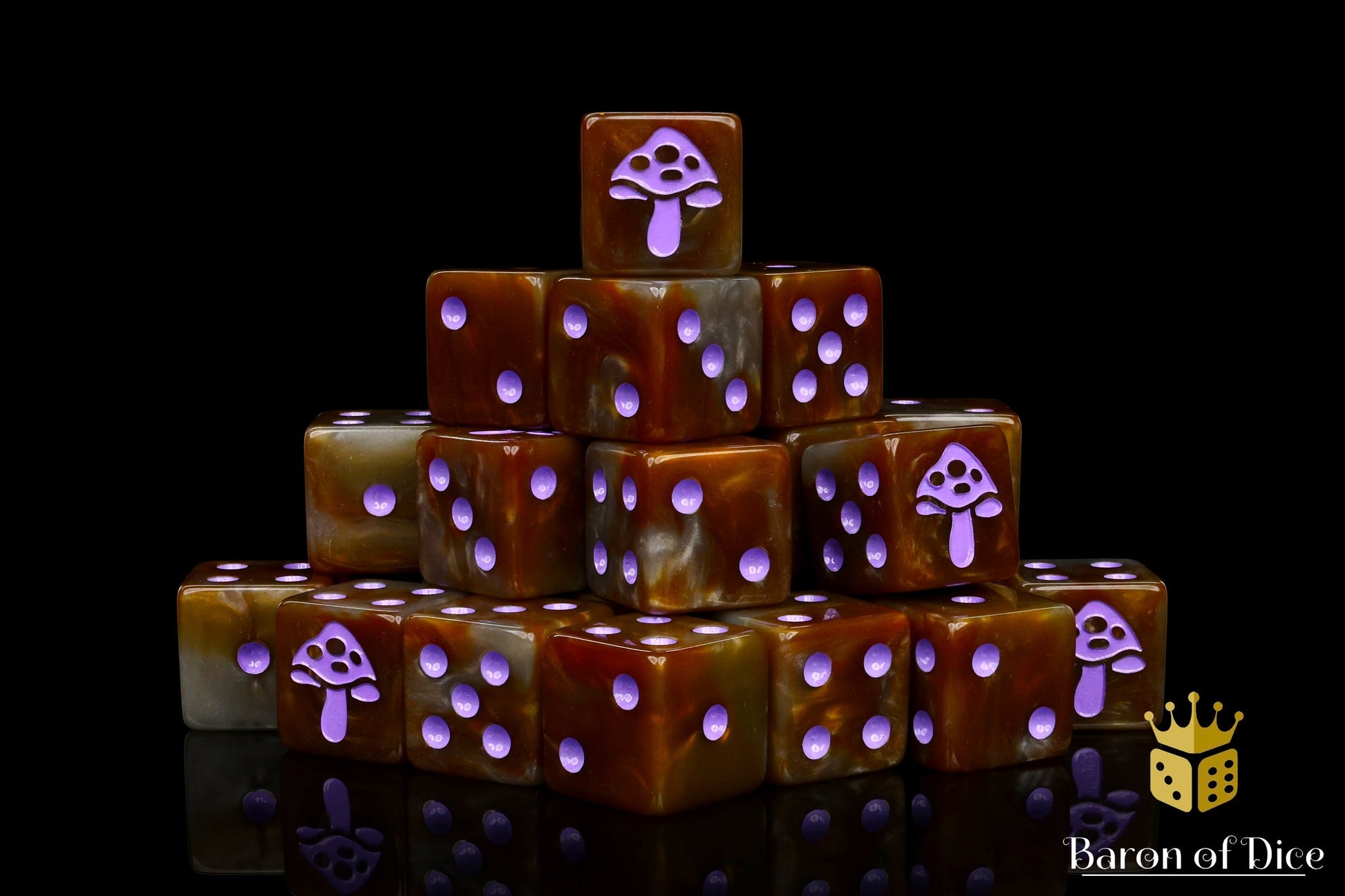 These contain a mix of cavern greys swirled with earthen whites and inlaid with the growth of purple Fungi; resin 16mm dice. These dice come in a round corner or square corner; choose wisely! The symbols are on the 6 side. Our premium dice come in unique reusable tins.