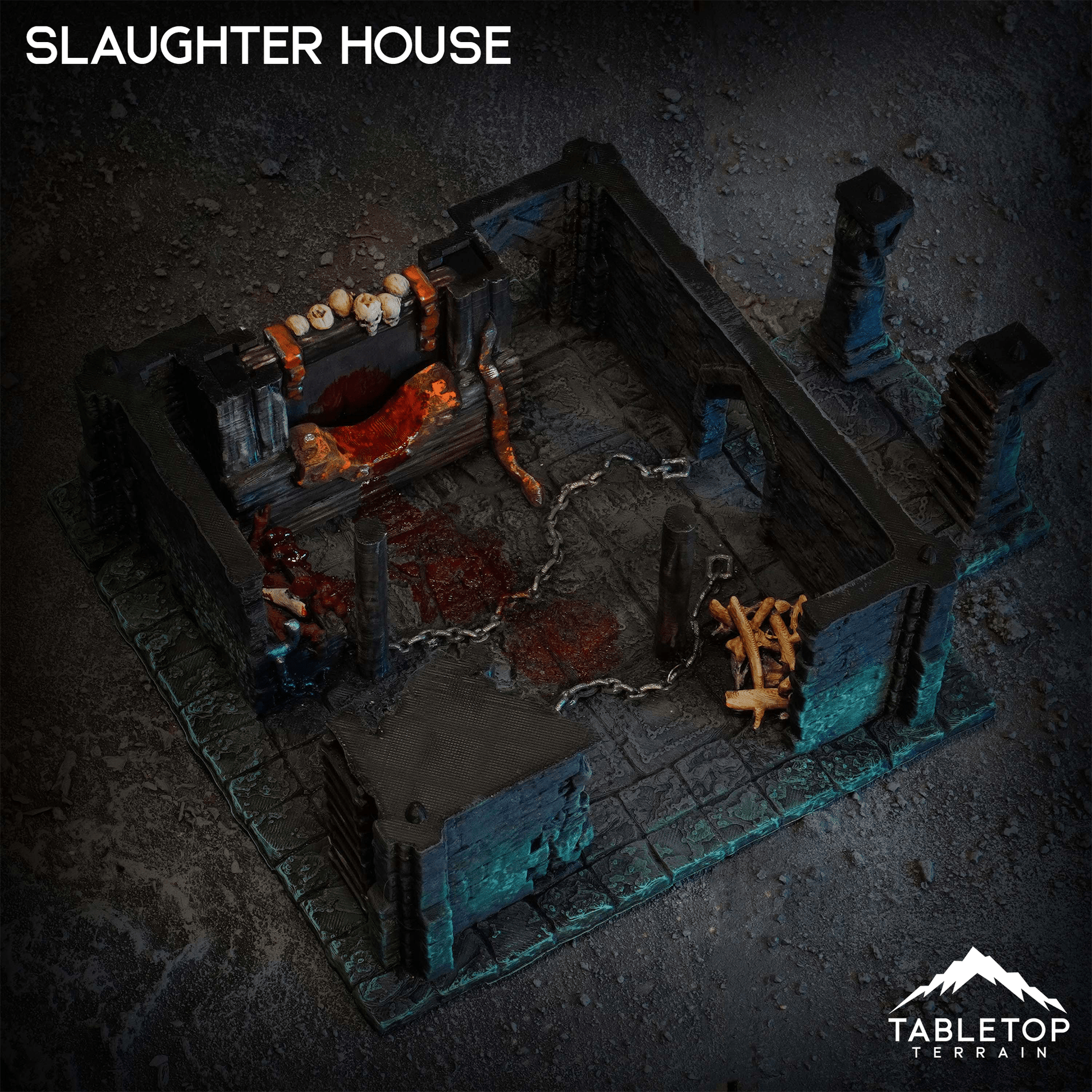 The Slaughter House is a large dynamic building with an actual sliding blade! Each level of the building is removable for easy internal miniature play. The inside of the model is detailed and textured, etched with crumbling stone and the remains of those who fought before. The Slaughter House is made for fantasy tabletop games, but can work for any genre.