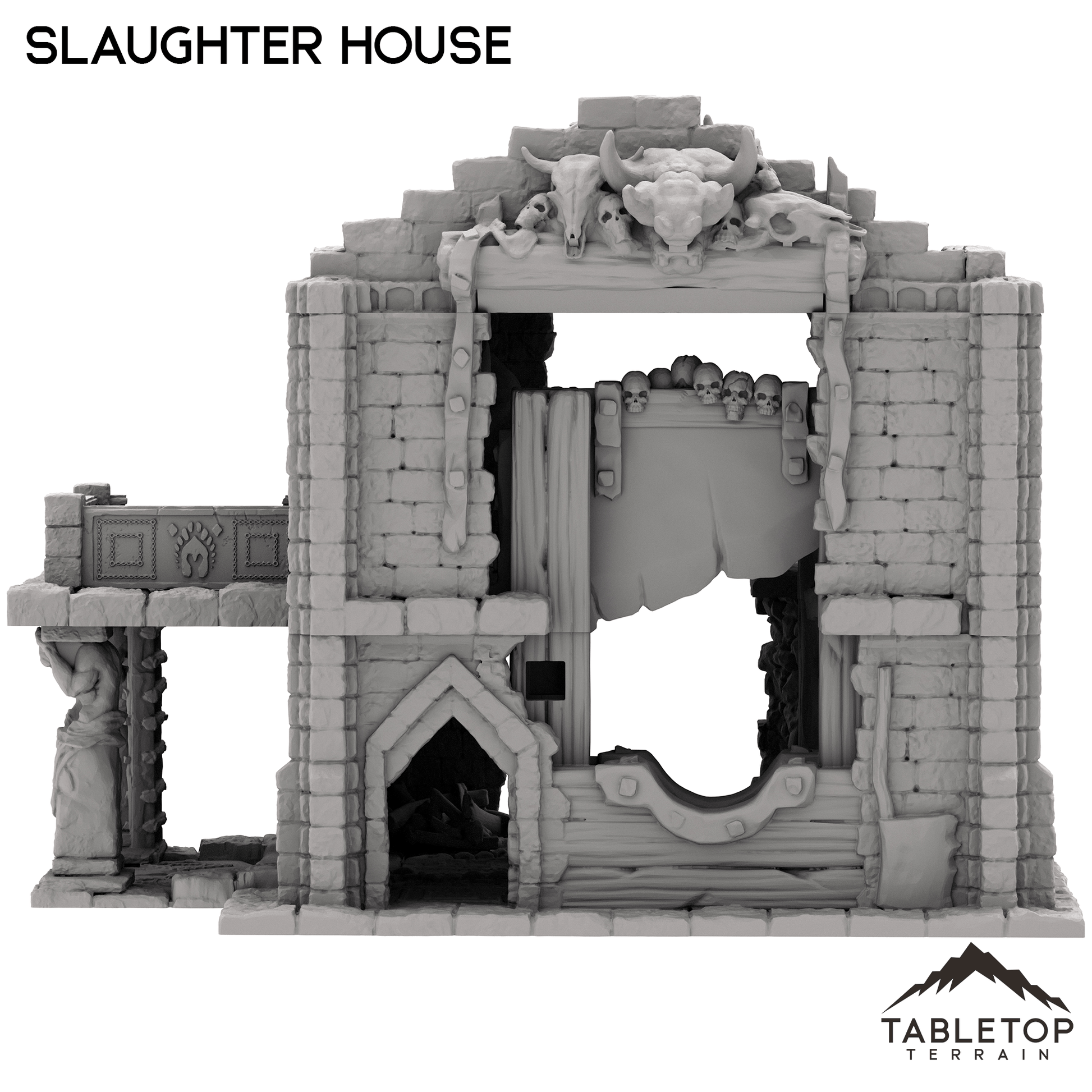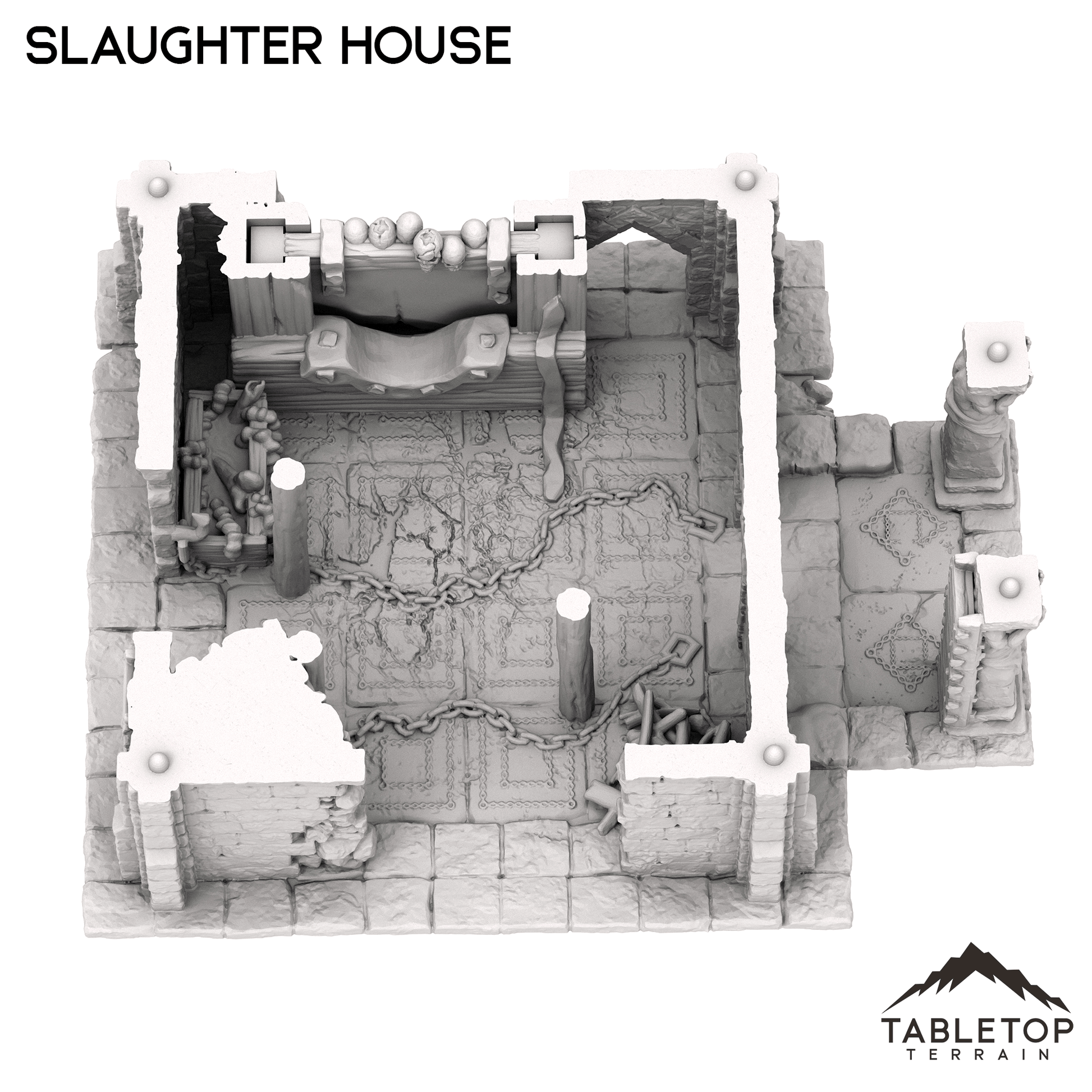 The Slaughter House is a large dynamic building with an actual sliding blade! Each level of the building is removable for easy internal miniature play. The inside of the model is detailed and textured, etched with crumbling stone and the remains of those who fought before. The Slaughter House is made for fantasy tabletop games, but can work for any genre.