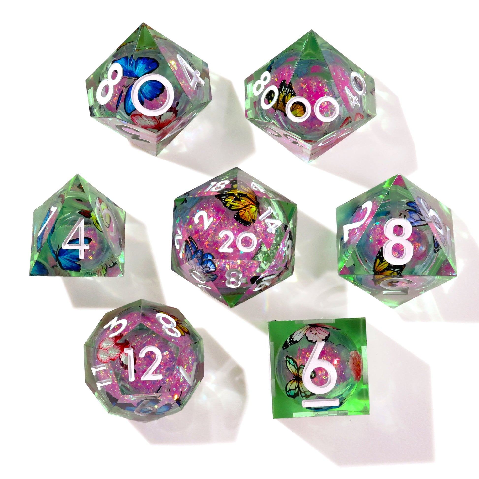 Explore the outdoors with fully painted butterflies in every dice! Featuring a liquid core, with bright pink flower glitter captured within each die. The dice are hand polished sharp corners, unique amongst our collection. This set is a grass colored translucent with etched fully painted butterflies embedded within each die and inlaid with a crisp white; premium hand-mixed resin 16mm dice set containing D4, D6, D8, D10, D10, D12, and D20.
