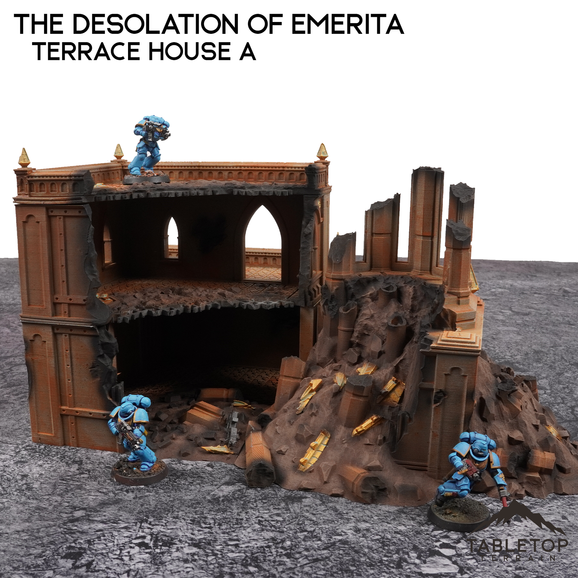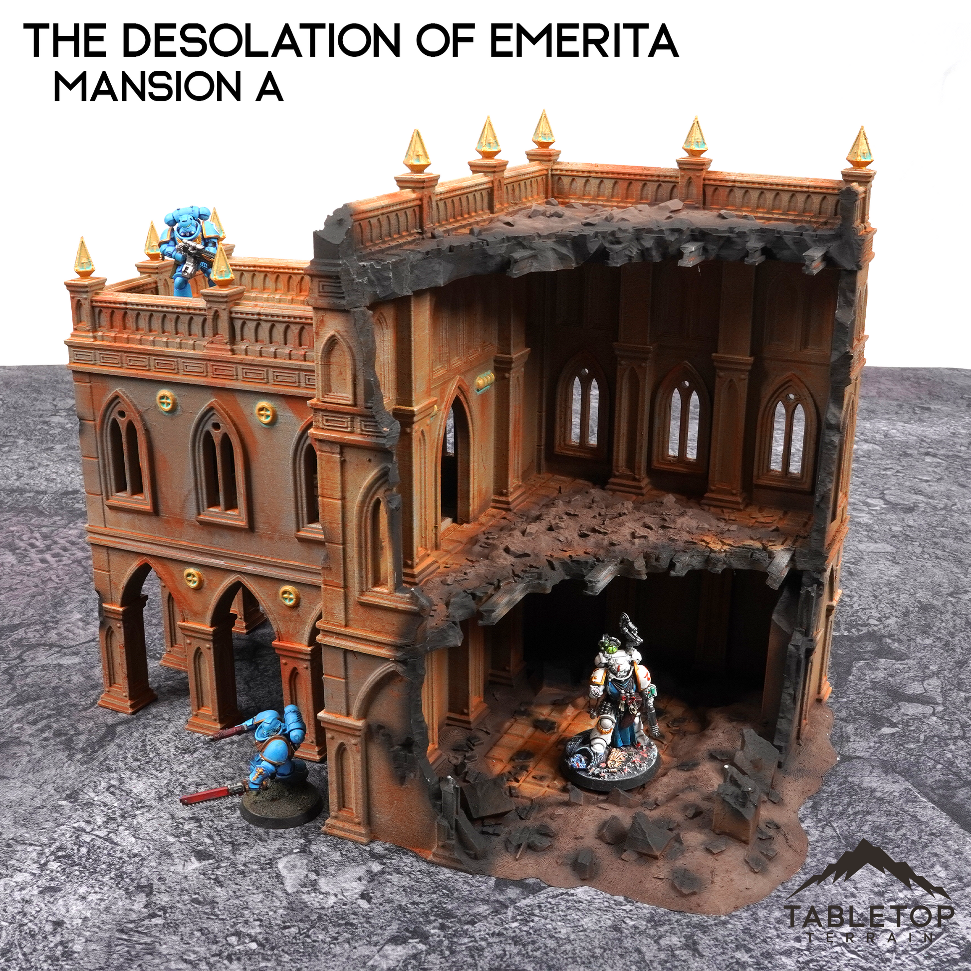 Explore the "Desolation of Emerita," a haunting collection of gothic ruins that evoke stories of a post apocalyptic city. This set features the remnants of once-grand structures: corner ruins of a building, crumbling mansions, and shattered terraced houses. Ideal for battles among the ruins or mysterious explorations, these models add a layer of dramatic history and tactical complexity to your gaming landscape. Buy either the whole set at a discount or any individual pieces of your choosing.