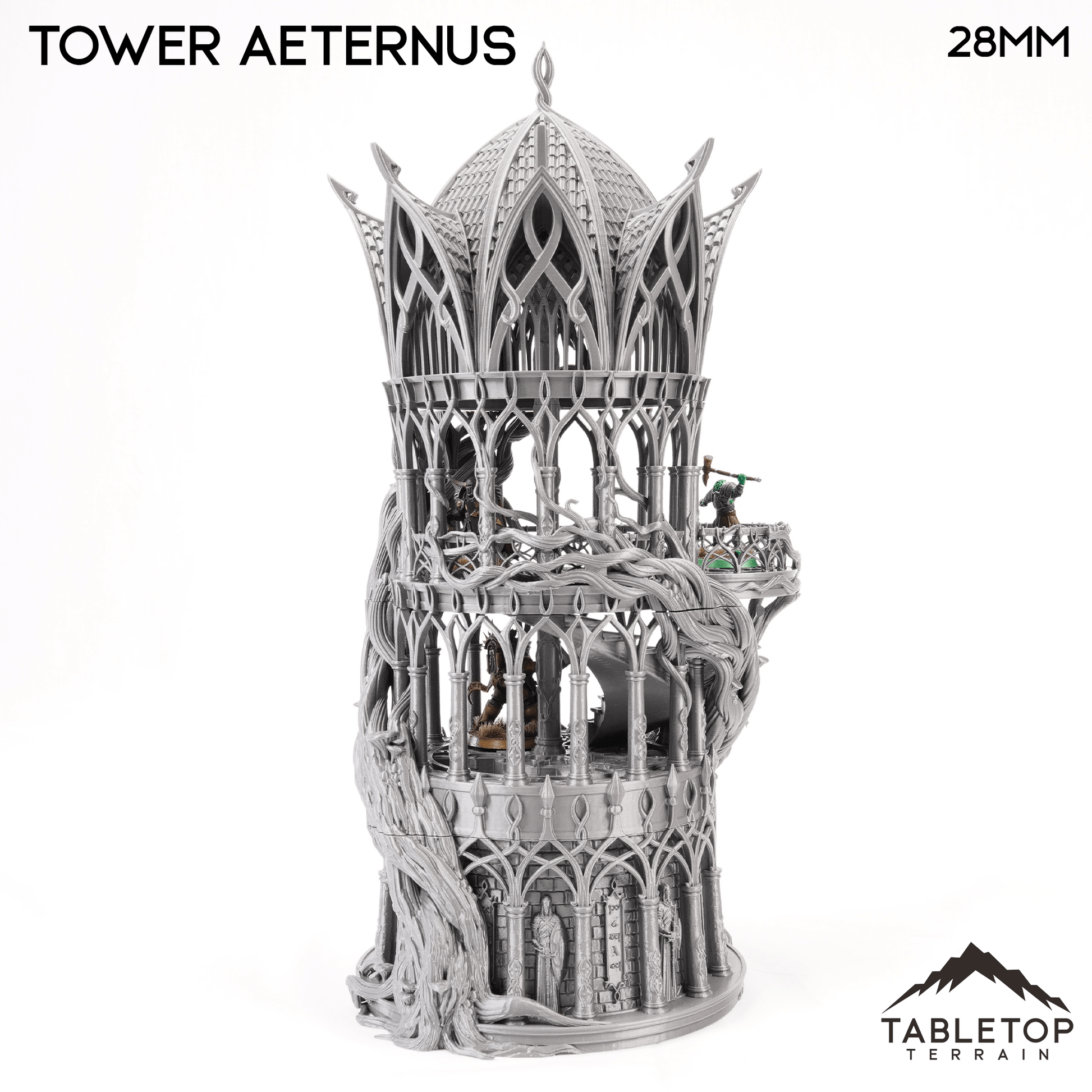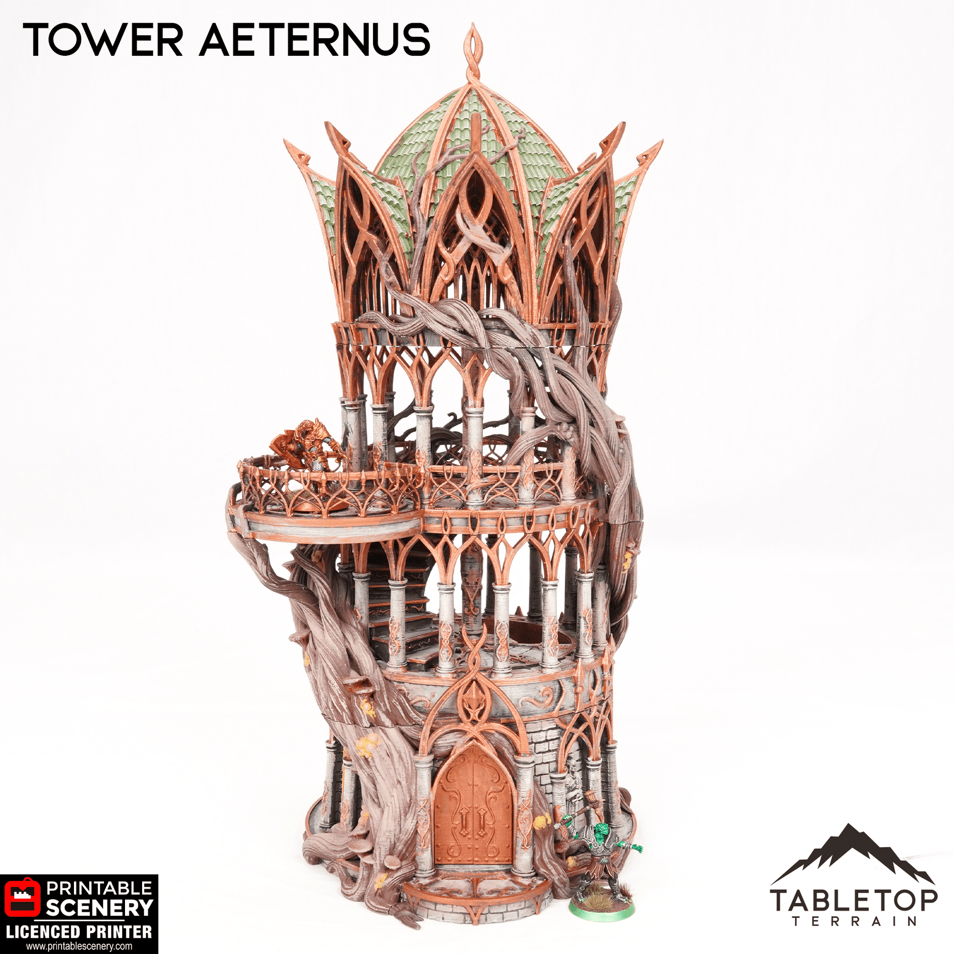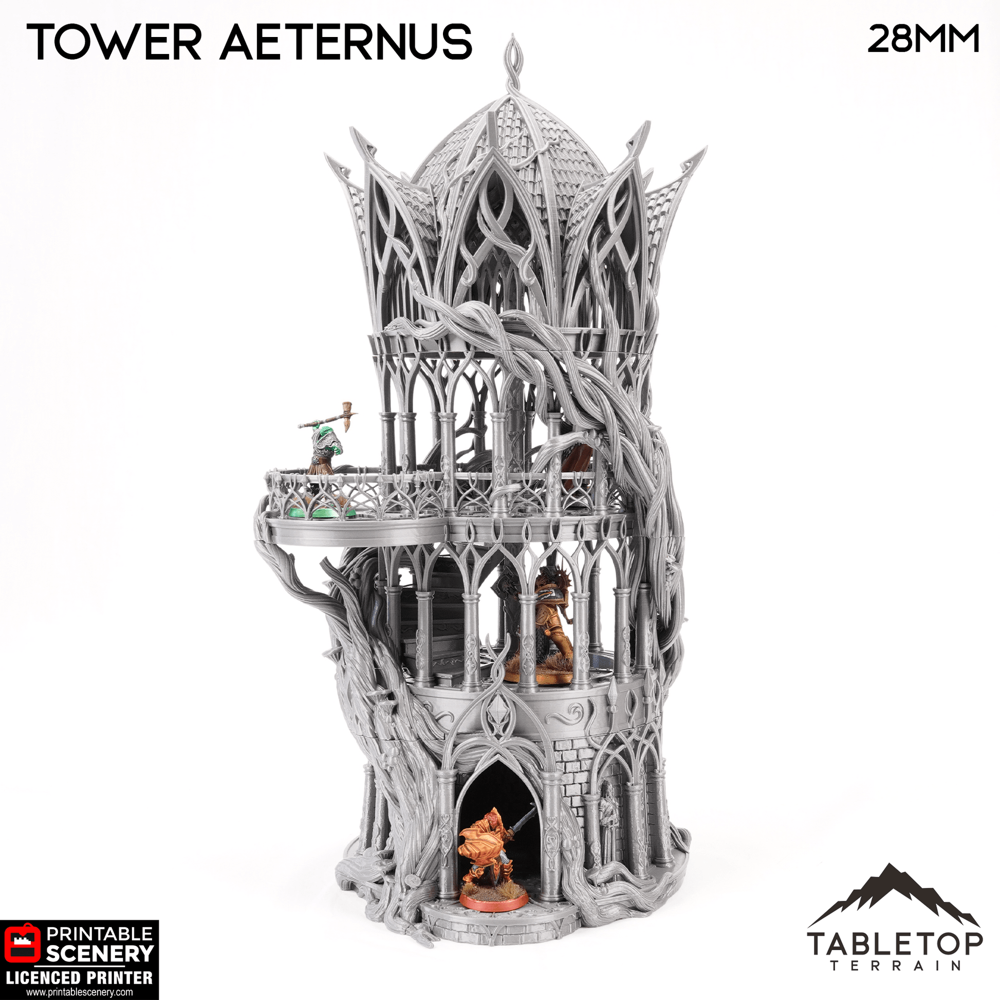 The Tower Aeternus is a large, Elven, mage's tower that features three levels, removable floors and roofs and functioning doors. This tower is massive and would be perfect for fantasy games such as Dungeons and Dragons (DND), Age of Sigmar (AoS), Pathfinder, Frostgrave, or Conquest.