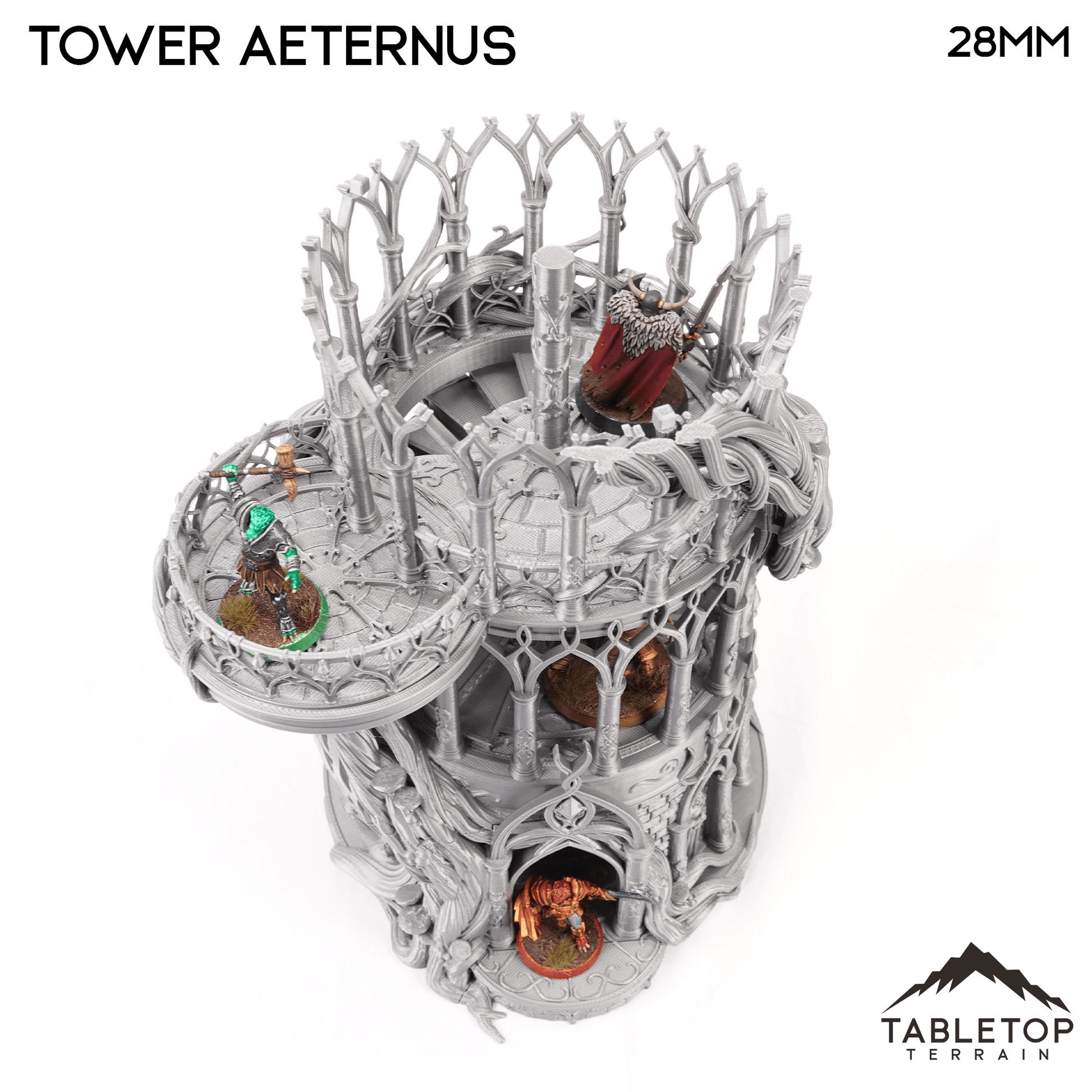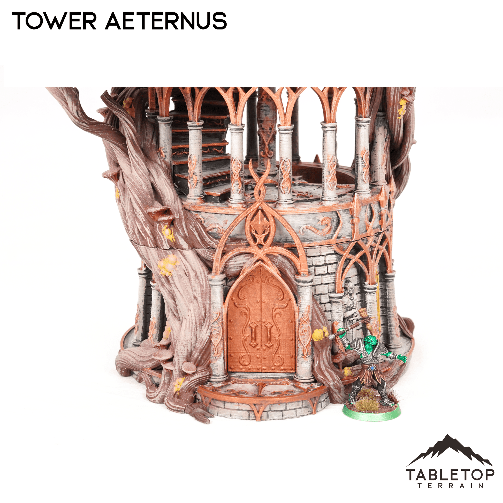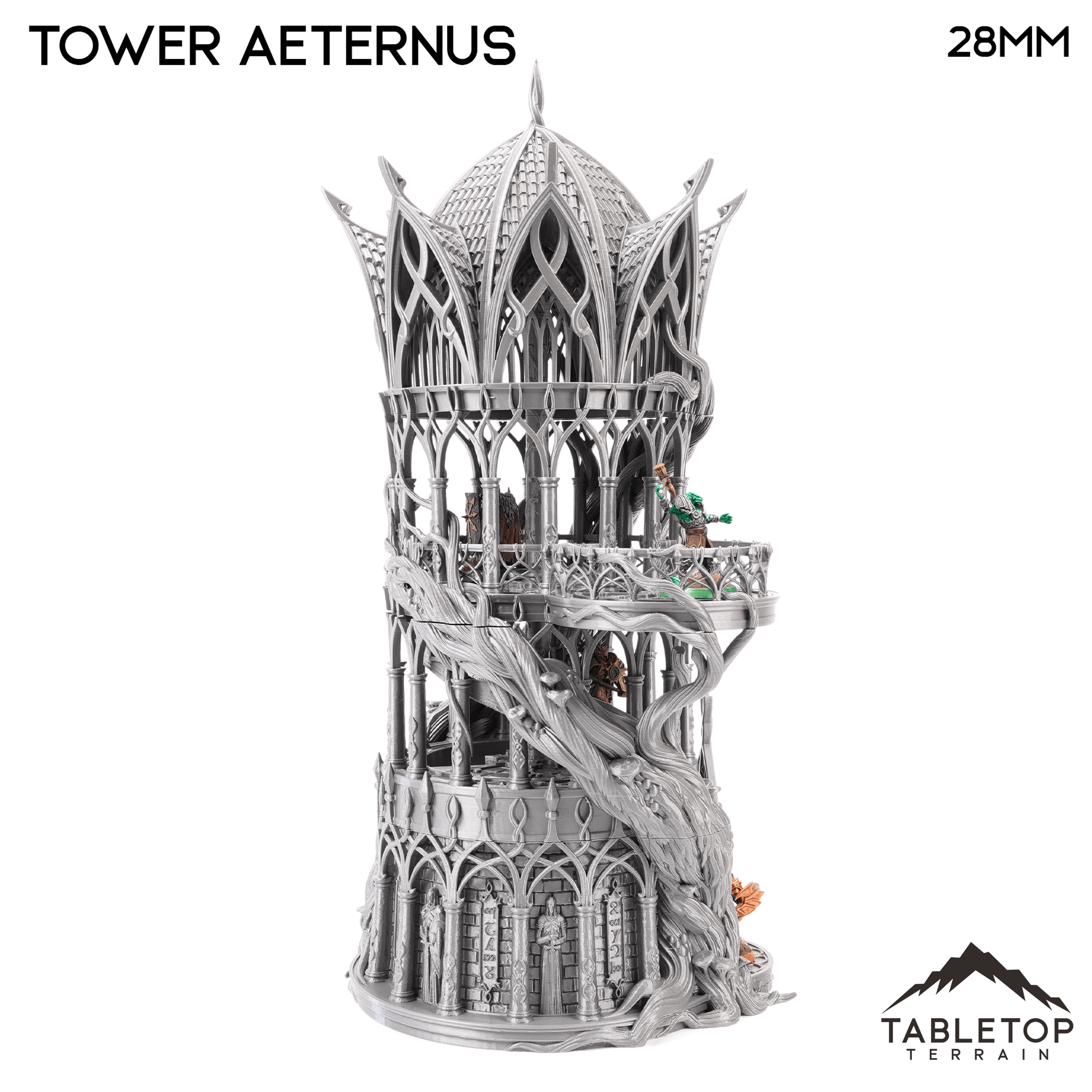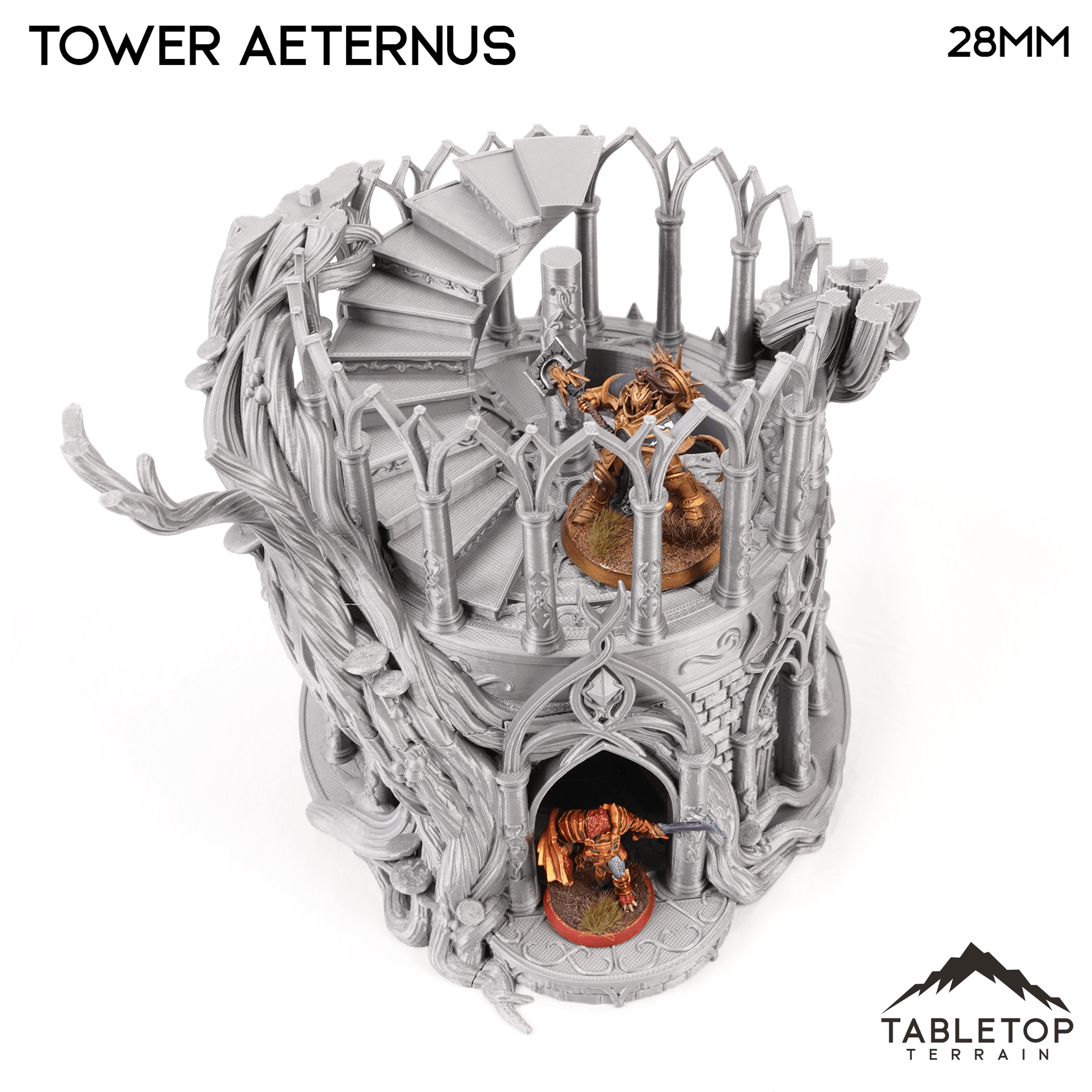 The Tower Aeternus is a large, Elven, mage's tower that features three levels, removable floors and roofs and functioning doors. This tower is massive and would be perfect for fantasy games such as Dungeons and Dragons (DND), Age of Sigmar (AoS), Pathfinder, Frostgrave, or Conquest.